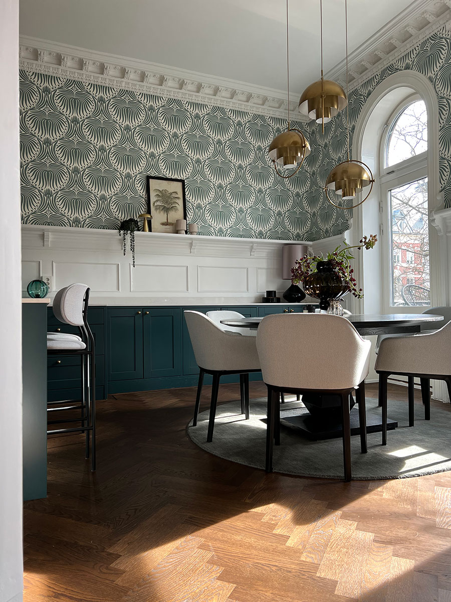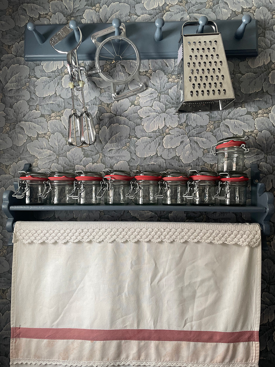 Ved siden av kjøkkenet er et eget spiskammers som rommer alt det praktiske og har mengder av oppbevaring til alt av kjøkkenutstyr. Her valgte Karina en vakker tapet fra Borås og malte hyller og knagger i Jotun Lady Byge for å matche kjøkkeninnredningen.