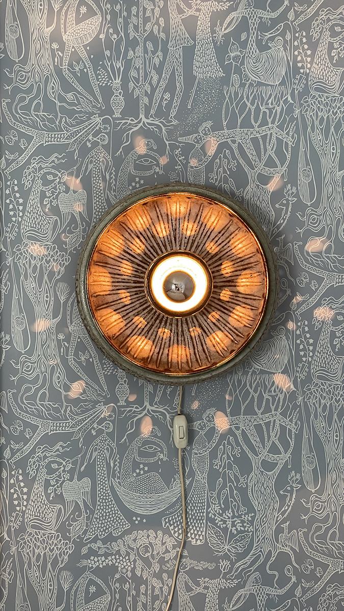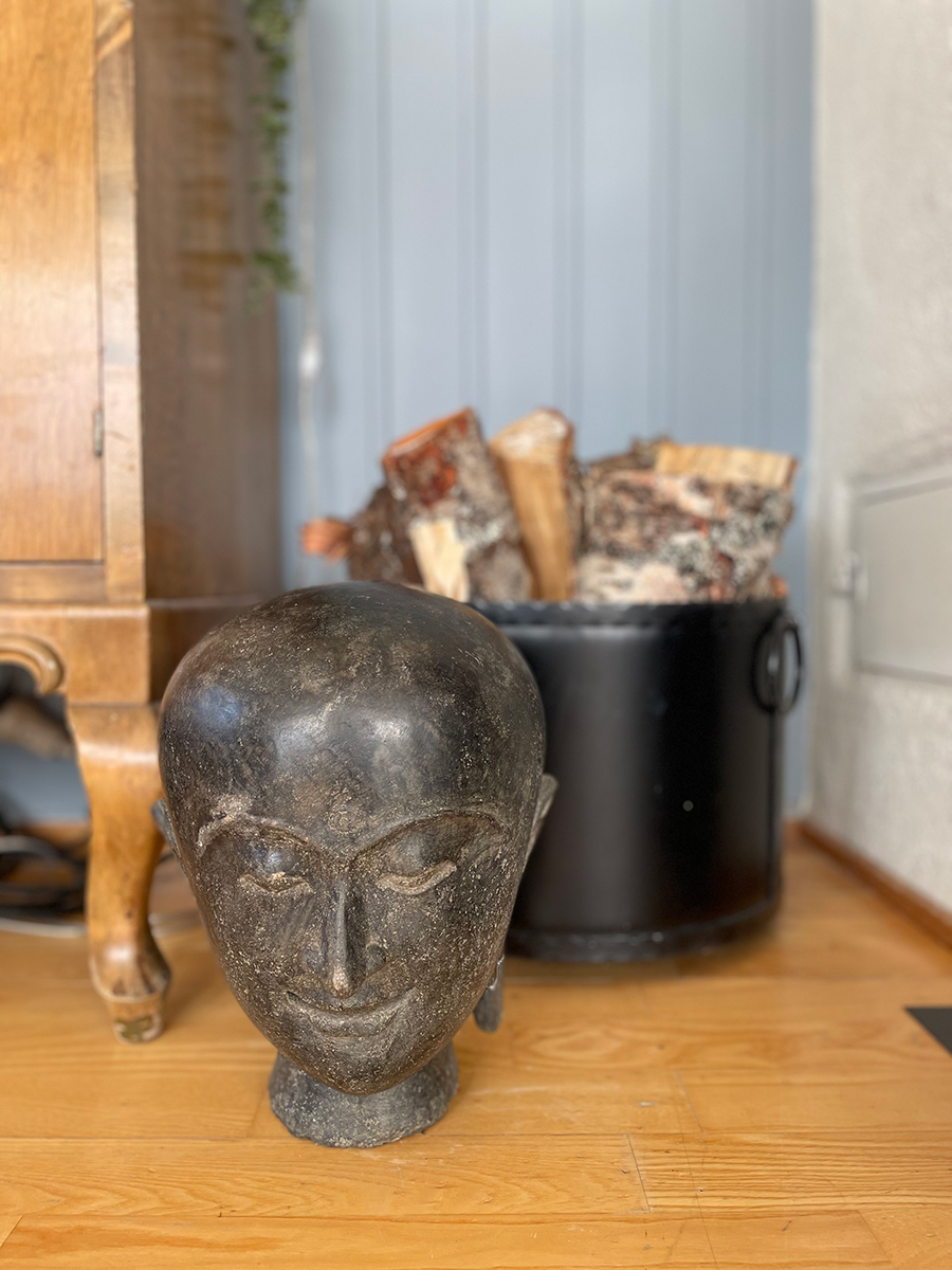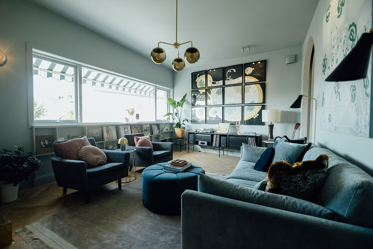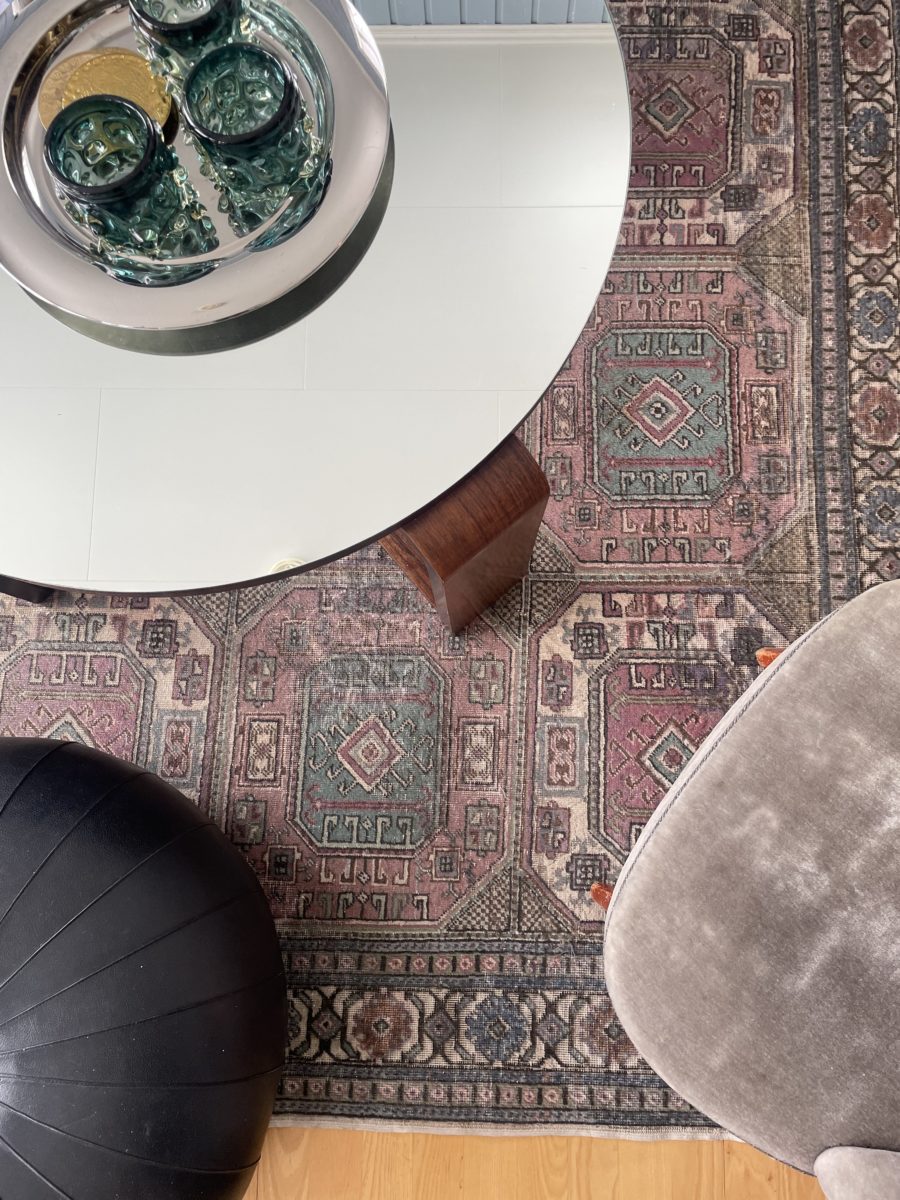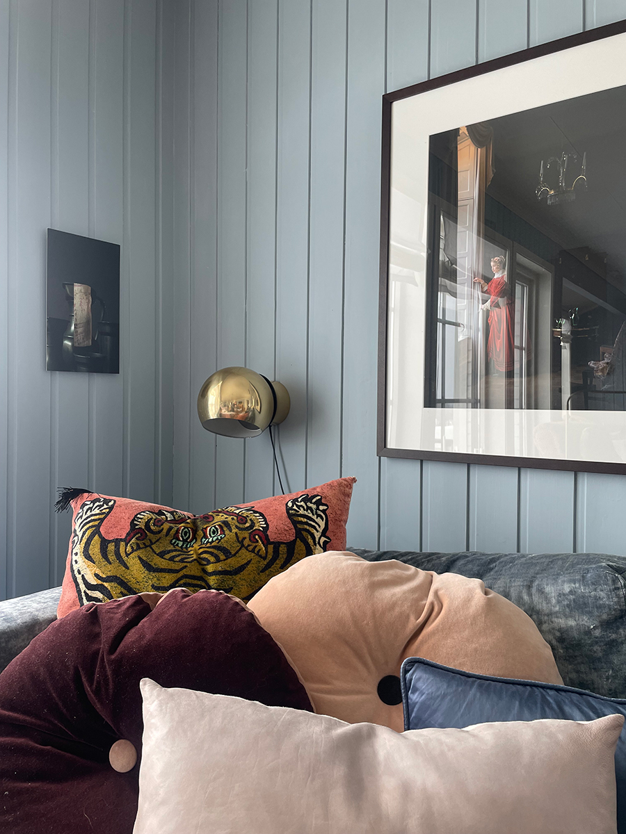 Som i alle rom i huset er veggene fylt av kunst og familiebilder, noe av det laget av familien selv eller av gode venner. Det mønstrede vintage Kilim-teppet fra Eske binder fargene i rommet sammen og matcher putene i sofaen som er en miks av Karinas favoritter fra House of Hackney, Christina Lundsteen, Aiayu og Society. Sofabordet med speilplate er et av hennes favoritt vintage-funn fra 1930-tallet og gjenspeiler formen på det runde sidebordet fra Mater og puffen i skinn.