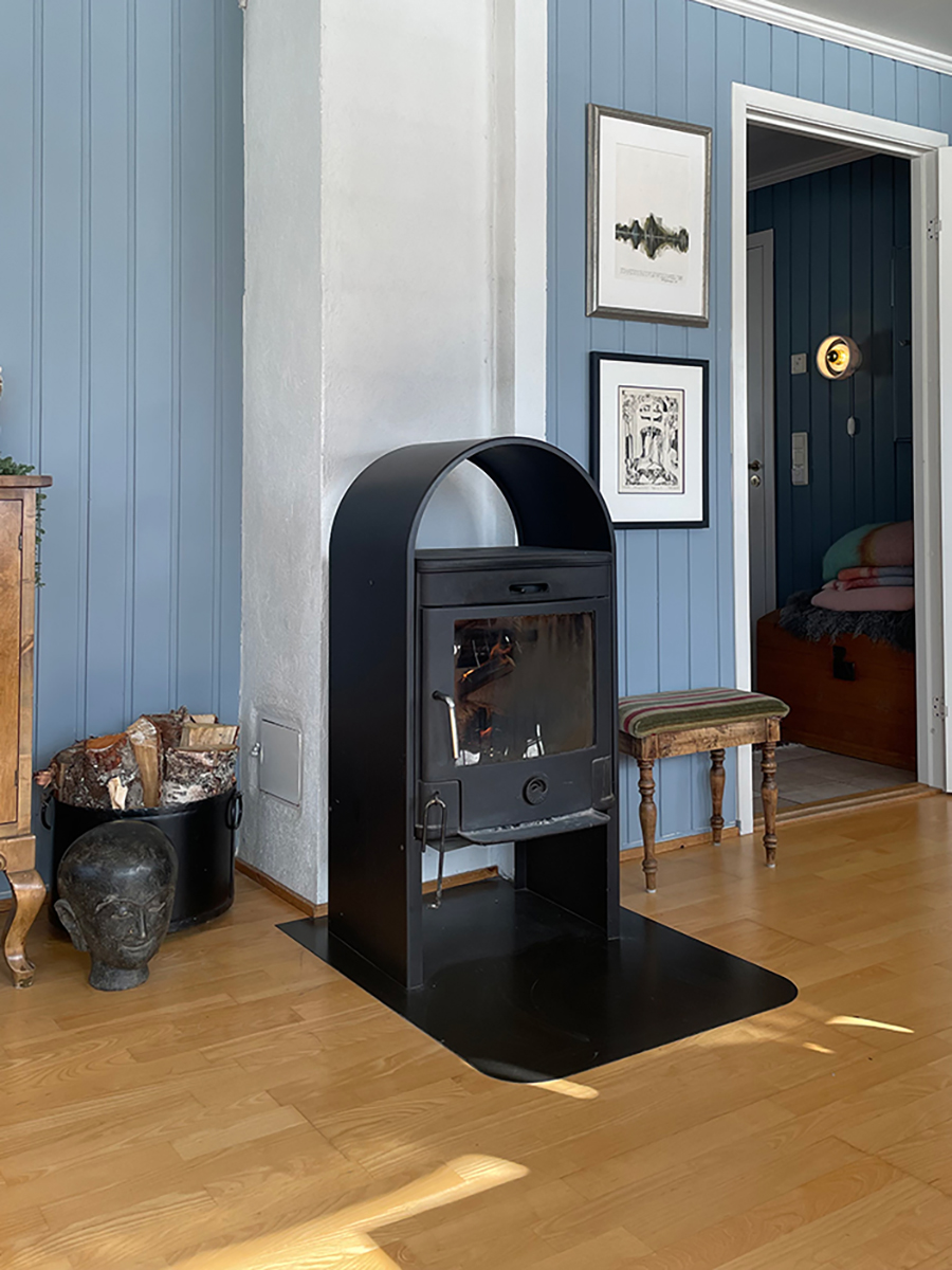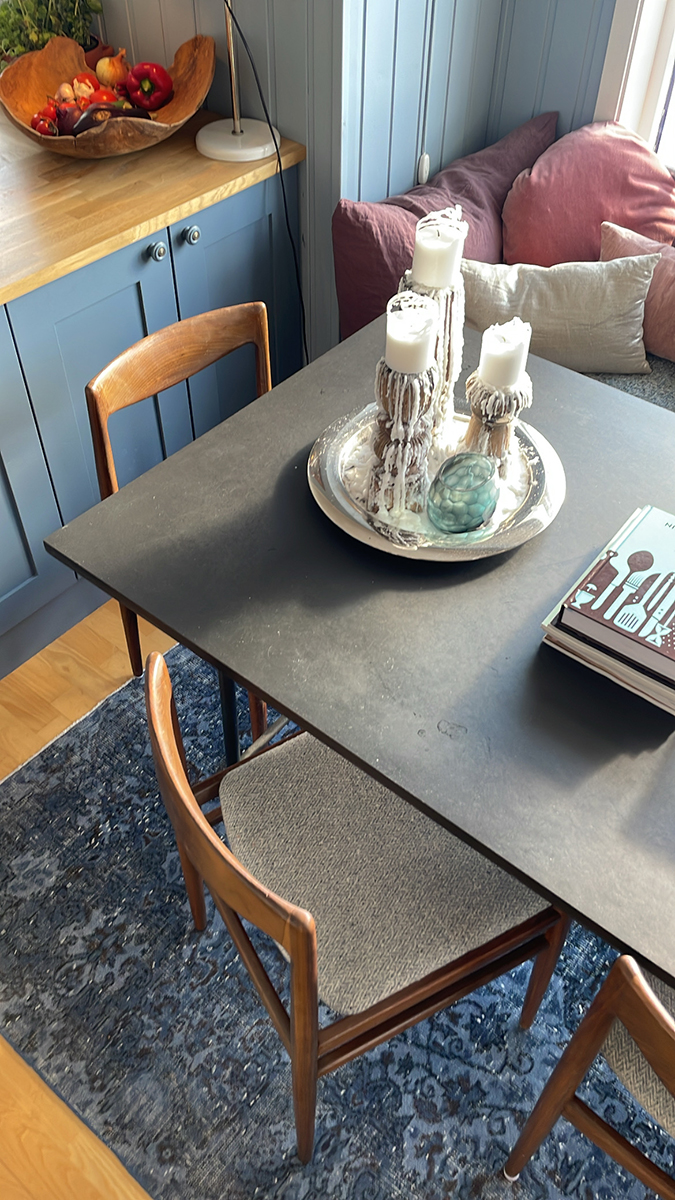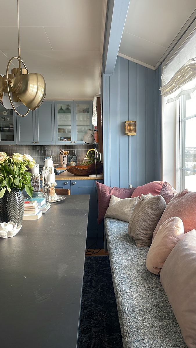 I vindusnisjen foran kjøkkenet hjalp en god venn å snekre en plassbygd spisesofa som er fylt med deilig puter fra Eske. Madrassen på spisebenken og setene på spisestolene som er kjøpt vintage er trukket om i klassiske stoffer i duse blåtoner som står godt til det unike vintage Kilim-teppet fra Eske.