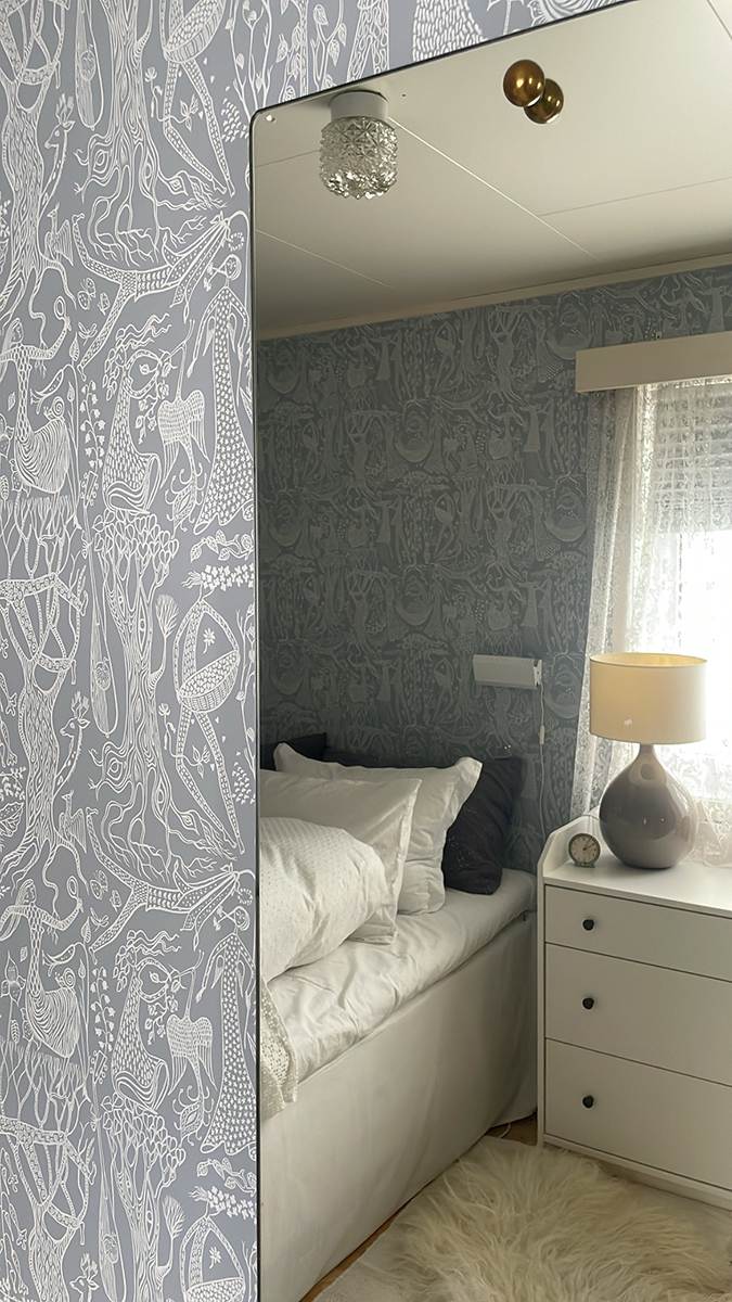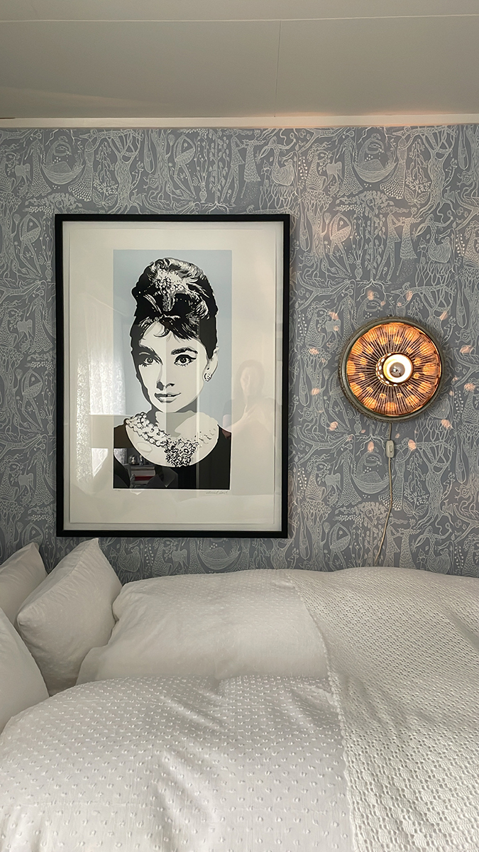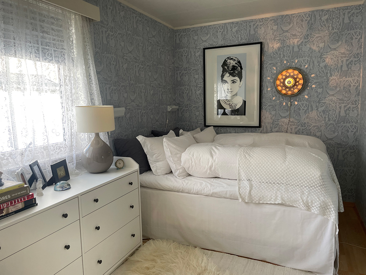 Det største soverommet har fått en vakker tapet fra Borås med et retro mønster i blått og hvitt. Hvitt sengetøy, hvite kommoder og hvite ryer og saueskinn på gulvet gir rommet et lyst og lett preg. Her kombineres flere forskjellige typer speil med enda flere lamper, blant annet vegglampen som er arvet etter Karinas onkel som hadde den hengende i stuen sin. Bildet av Audrey Hepburn er laget av den britiske kunstneren Conrad Leach som Karina samarbeidet med i mange år fra oppstarten av Eske.