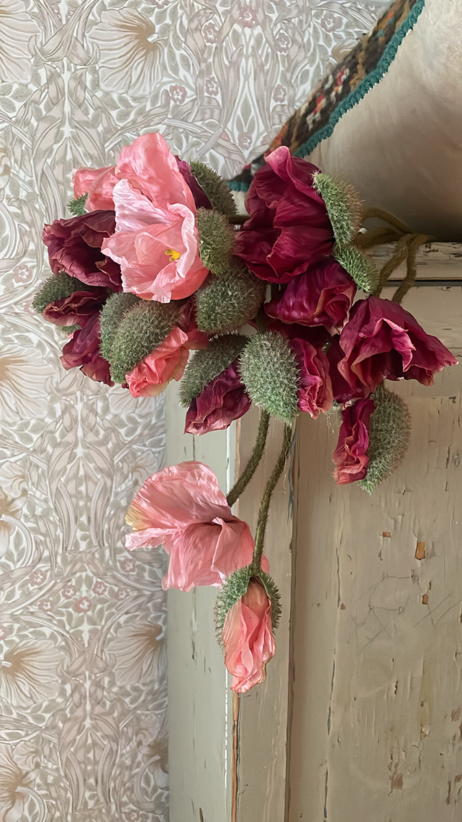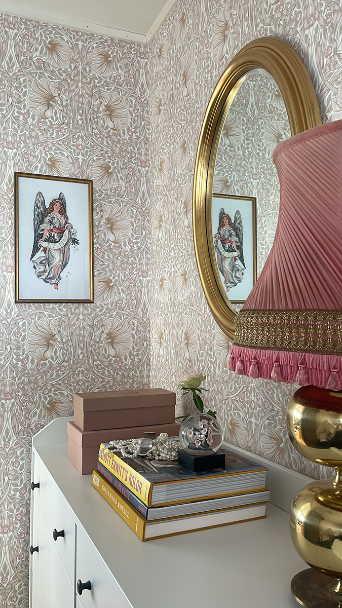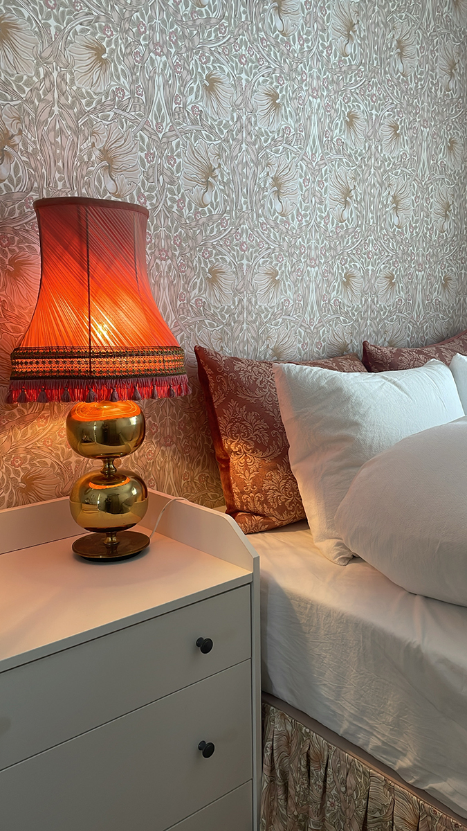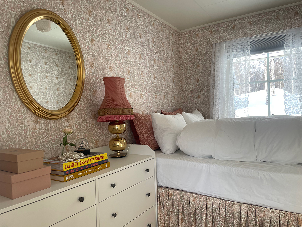 Hytten har 3 soverom, og alle fikk en egen fargepalett. I det minste rommet tok Karina utgangspunkt i den klassiske Pimpernel-tapeten fra Morris & Co i en dus rosa fargekombinasjon. Sengen ble plassbygd med god plass til oppbevaring under, og foran kom et sengeskjørt i samme mønster som tapeten bestilt gjennom Eskes prosjektavdeling. Selv gardinbrettet er tapetsert i samme mønster og glir sømløst inn i resten av rommet.