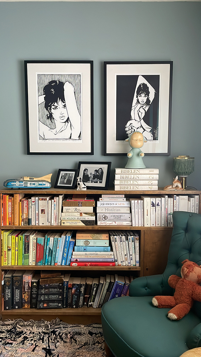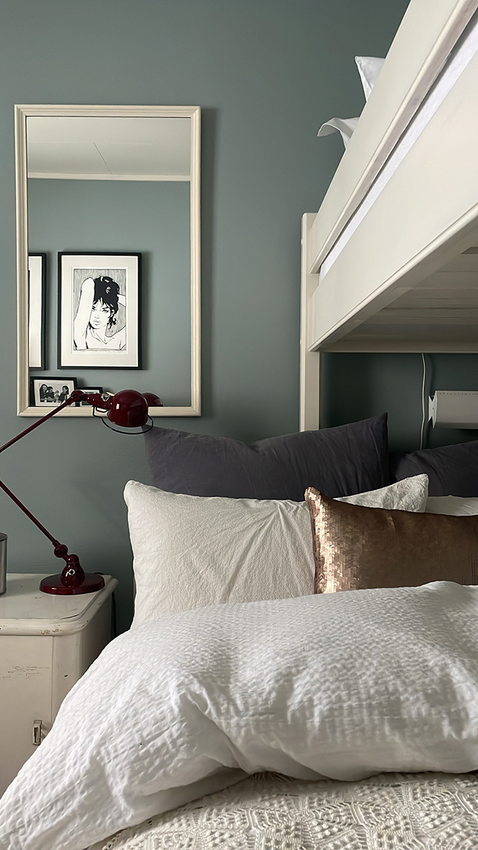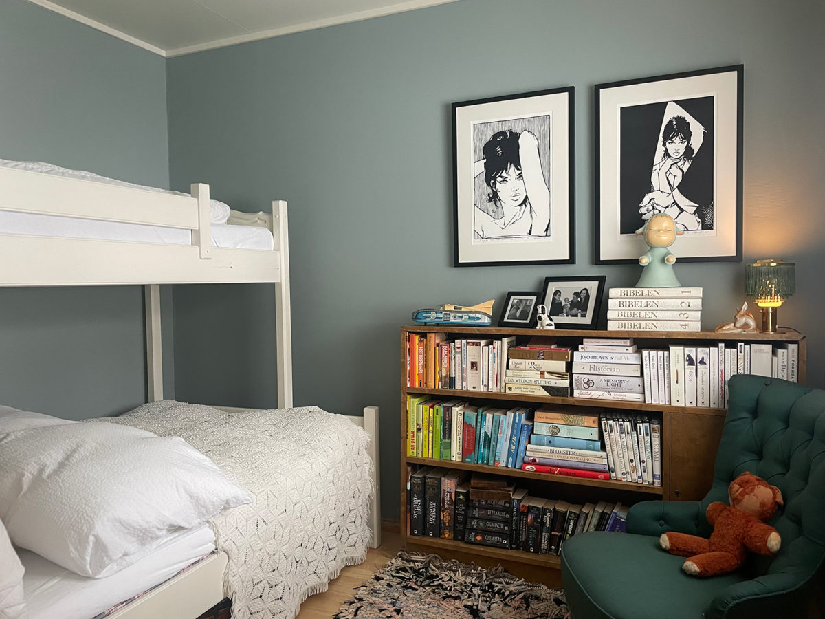 Det siste soverommet fikk en lun grønnfarge med Jotun Lady Iconic. Køyesengen gir godt med sengeplass til tantebarn eller andre gjester, og rommet kan også brukes til å trekke seg tilbake og lese en god bok ro og fred. Bokhyllen er arvet fra besteforeldrene og sto før i deres finstue. Over bokhyllen henger bilder av Modesty Blaze laget av den norske kunstneren Ronny Bang!. Da Karina var liten drømte hun om å bli spion og mestertyv som Modesty Blaze og elsket stilen og uttrykket hennes – inkludert det lange mørke håret og tidenes beste jumpsuits!