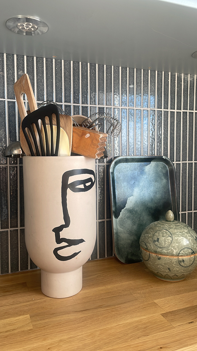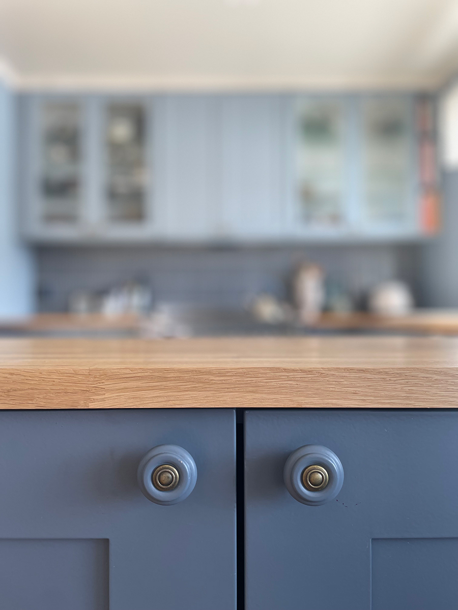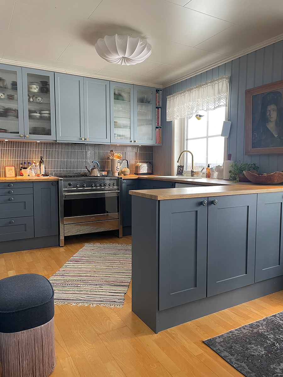 Kjøkkenet er selve hjertet i huset da Karina elsker å lage mat og samle venner og familie til store måltider rundt det lange spisebordet fra Hay. Med hjelp fra gode venner pusset hun selv opp kjøkkenet. Den originale kjøkkeninnredningen i ask ble gjenbrukt på best mulig måte ved å bruke de gamle overskapene som en ny kjøkkenøy mot spisebord og stue. Nye overskap ble kjøpt fra Huseby Kjøkken og alt ble malt i farger fra Jotun. Overskapene fikk samme farge som veggene, Jotun Lady Ocean Air, og underskapene fikk en mørkere tone, Jotun Lady Byge. Til og med håndtakene ble malt og gjenbrukt i kombinasjon med nye håndtak på overskapene fra R.Bergersen. Over benkeplaten i tre fra Obs Bygg la Karina selv vakre japanske fliser fra danske Marokk i en perfekt blågrå tone som binder fargene på kjøkkenet sammen.