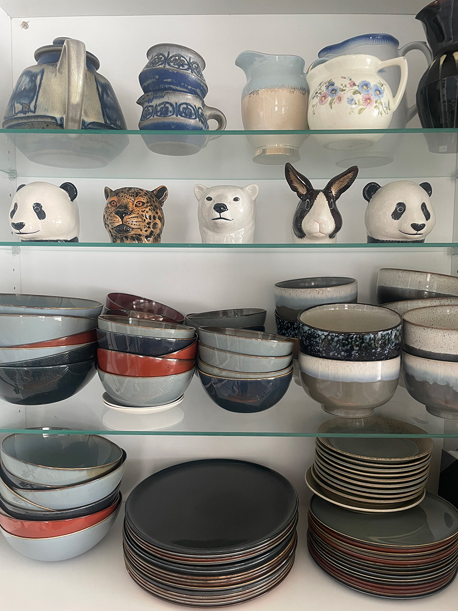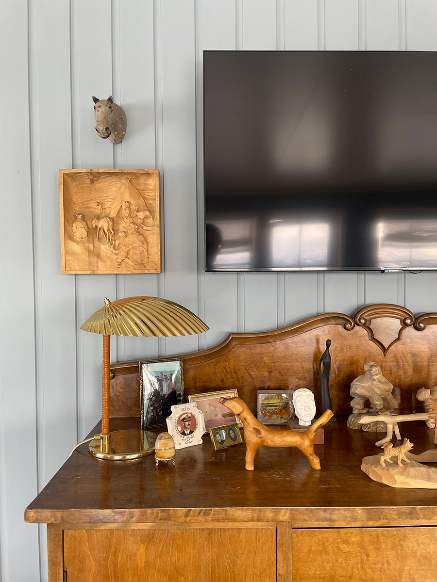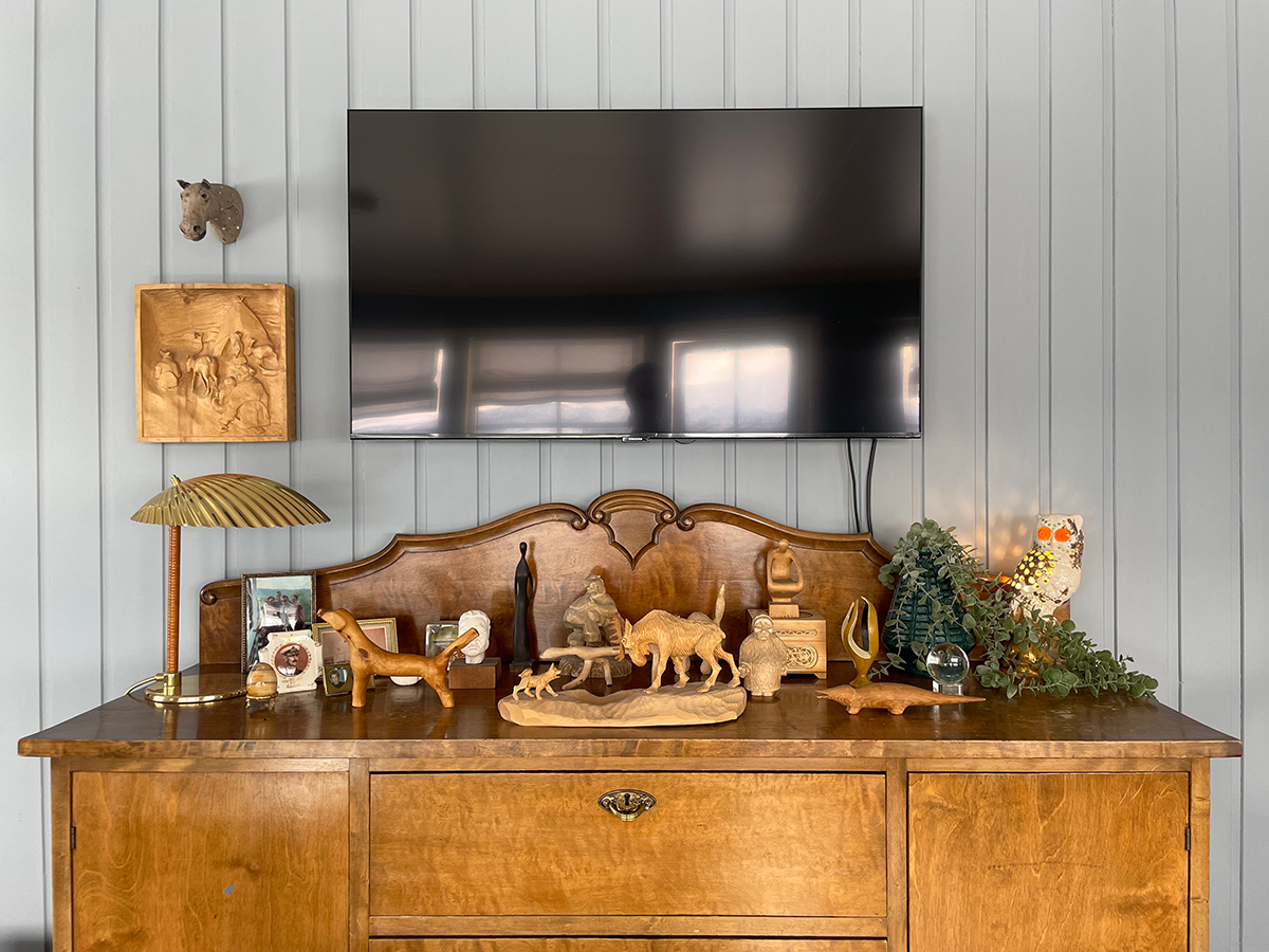 Skjenken med alle figurene ble laget på bestilling til Karinas besteforeldre da de bygget hus på gården på slutten av 30-tallet. Den sto i finstuen deres og gjemte alt fra håndvevde duker og lommetørkler til blomsterfrø og sjokolade. På skjenken er det vist frem figurer laget av Karinas onkel som var en fantastisk kunstner og utdannet interiør arkitekt – den første Nordlending som fikk tittelen fra Kunsthøyskolen på 60-tallet.