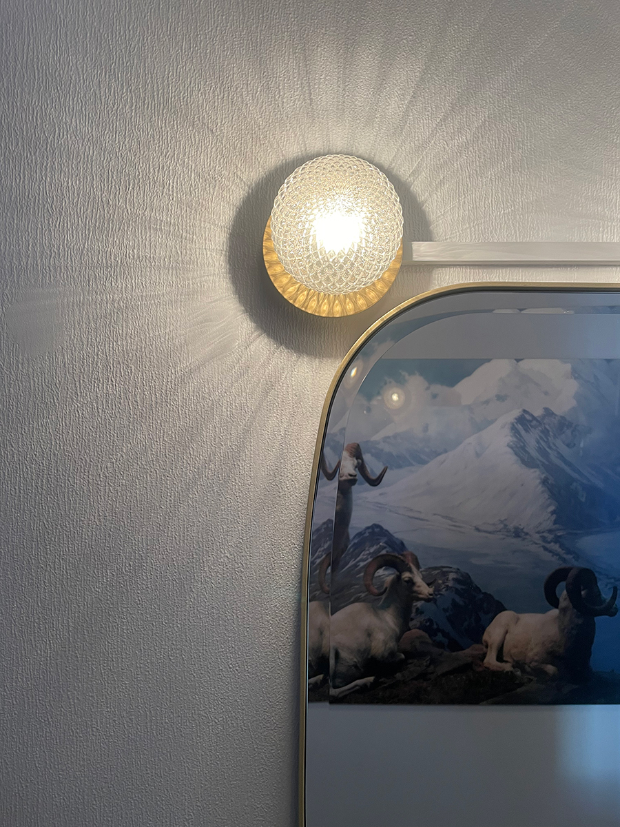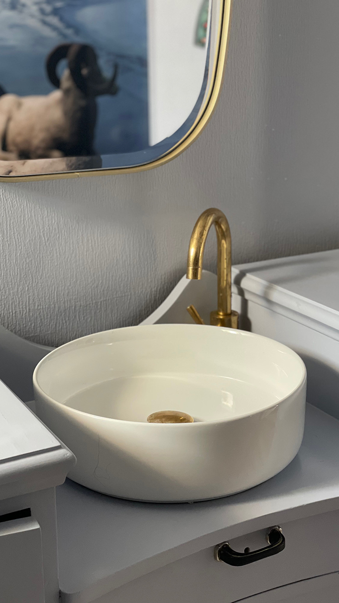Servantmøbelet ble også laget til besteforeldrenes hus på 30-tallet og ble brukt som soveromskommode da Karina vokste opp der. Den gang var den lysegrønn, men Karina malte den i samme farge som tak og vegg for å øke romfølelsen. Over kommoden henger et enkelt speil med messingramme kjøpt brukt fra en frisørsalong sammen med vakre baderomslamper fra Nuura.