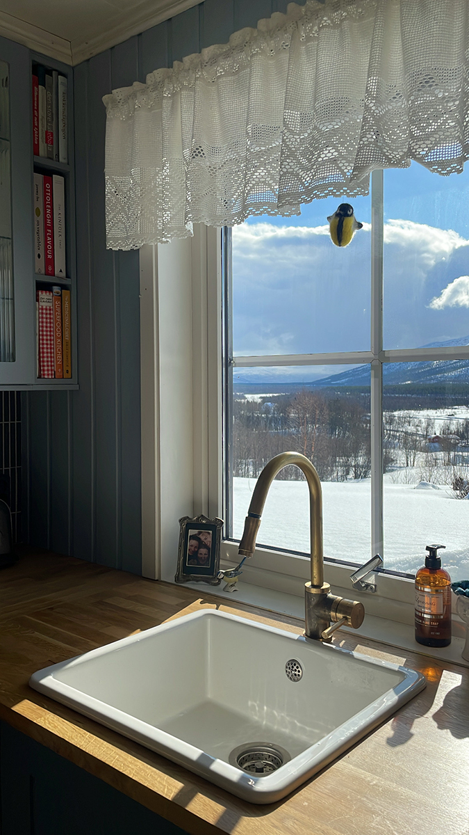 For et par år siden fikk Karina sjansen å kjøpe tantens hytte som ble bygd øverst på gården med utsikt over hele Målselv-dalen og de vakre Istindene. På denne bakketoppen høstet besteforeldrene hennes poteter på 50-tallet og hun sov i telt med venninnene på 80-tallet og drømte om eventyr ute i den store verden. Nå er hun tilbake her så ofte hun kan og pynter litt på interiøret hver eneste gang. Selv om hytten ikke er stor rommer den et stort allrom med stue og åpent kjøkken med et rommelig spisebord, eget spiskammers, tre soverom, en stor entre og et deilig bad.