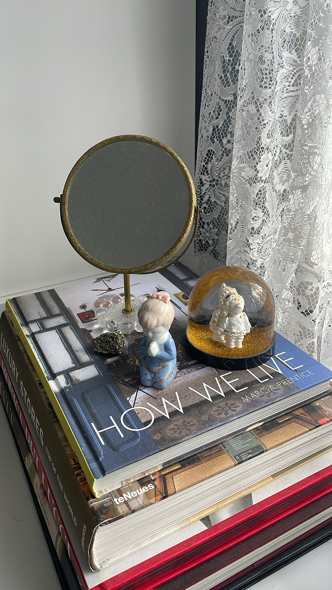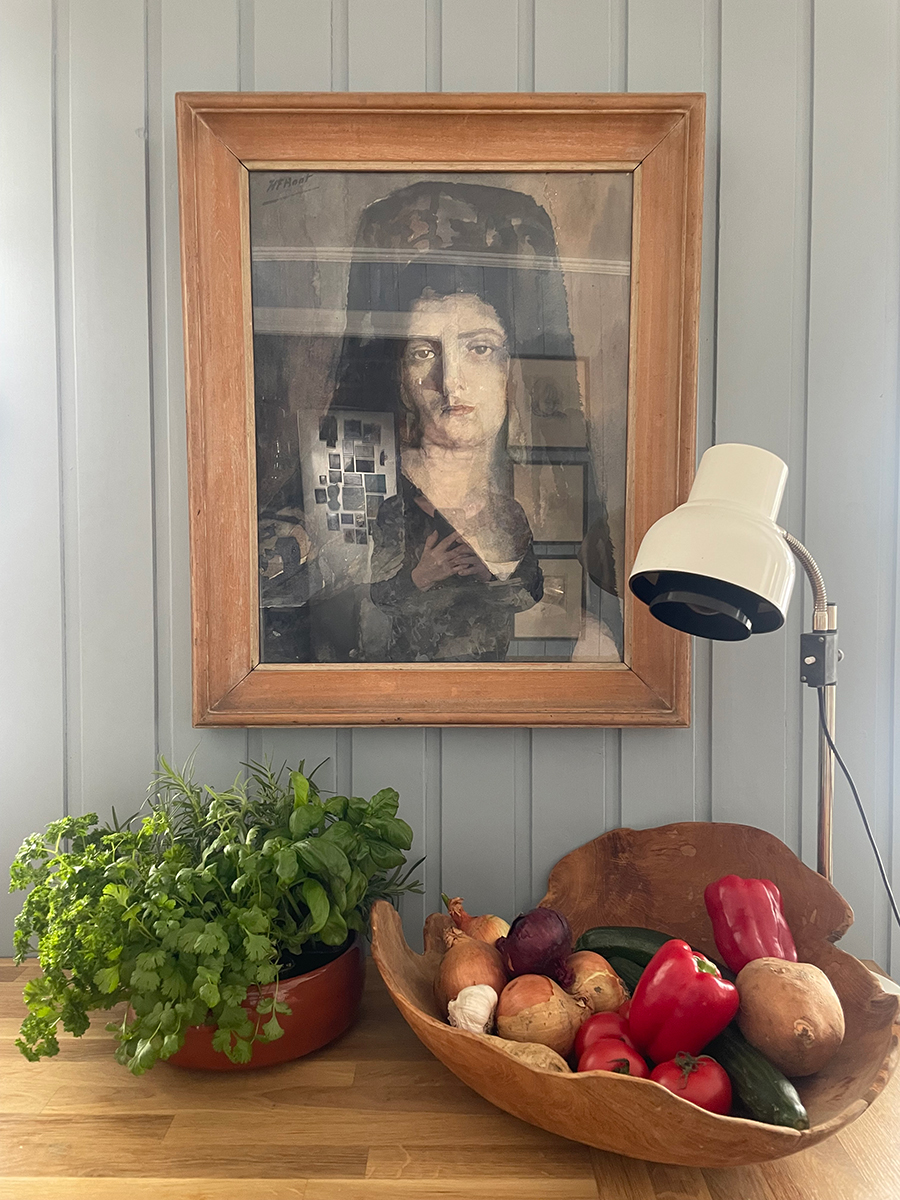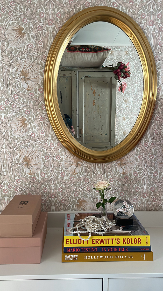 Oppbevaring er også viktig i et lite hus, og her har Karina brukt en kombinasjon av Ikea-kommoder og et patinert skap arvet etter onkelen. På kommodene står en vintage lampefot kjøpt hos favorittbutikken Jane Doe i Oslo da den var åpen i kombinasjon med en vintage skjerm kjøpt brukt. Speilet er arvet etter tanten til Karina og det broderte bildet laget av hennes søster til bestemoren. Bøker finnes overalt i huset og fungerer som en perfekt base for små stilleben.