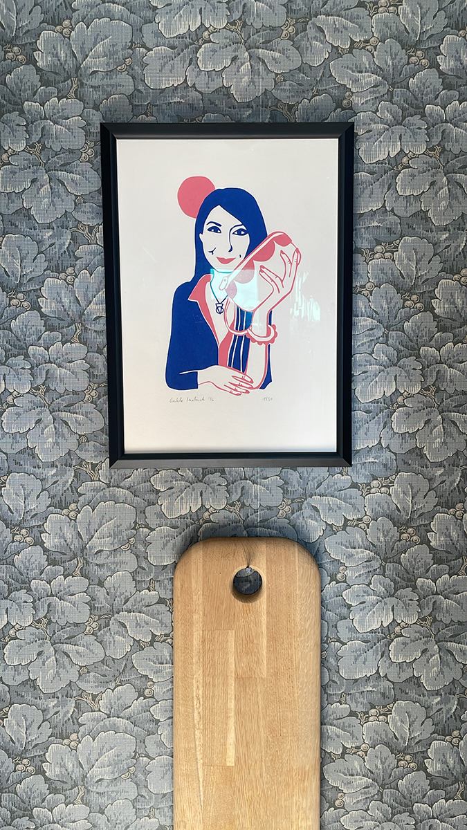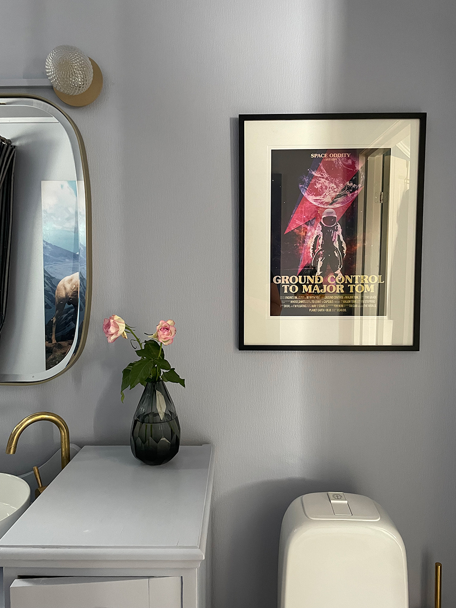 Badet ble pusset opp med enkle grep i sommerferien 2024. Flisene på gulvet fikk lov å bli, men vegg og tak ble malt i Jotun Lady Klassisk Blå for å gi den perfekte bakgrunn til det store fotoet fra den tyske fotografen Henning Bock som Karina har hatt med seg siden tiden hun bodde og drev butikk i København.