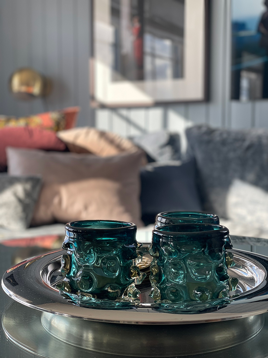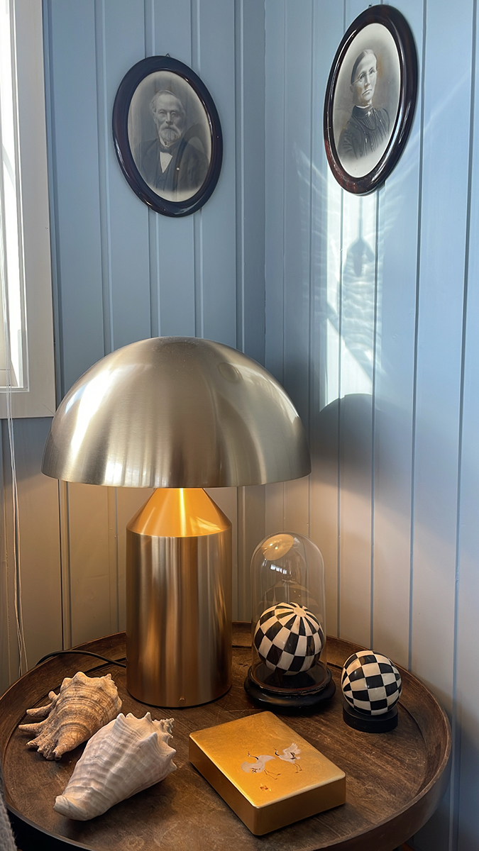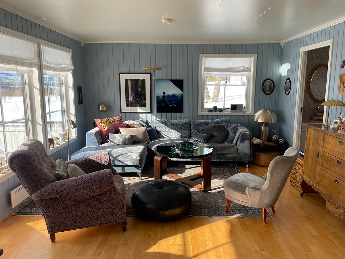 Stuen er i andre enden av allrommet og er innredet for lange kvelder med bordspill, gode samtaler eller en spennende bok. Sofaen med chaise lounge rommer mange, og lenestolen som Karina kjøpte til sin første leilighet i Amsterdam for 30 år siden er fantastisk å synke ned i. Begge er trukket i stoff fra Osborne & Little. En mengde lamper i messing gir den perfekte stemningen utover vinterkveldene, men på sommeren lyser midnattsolen gjennom de store vinduene.