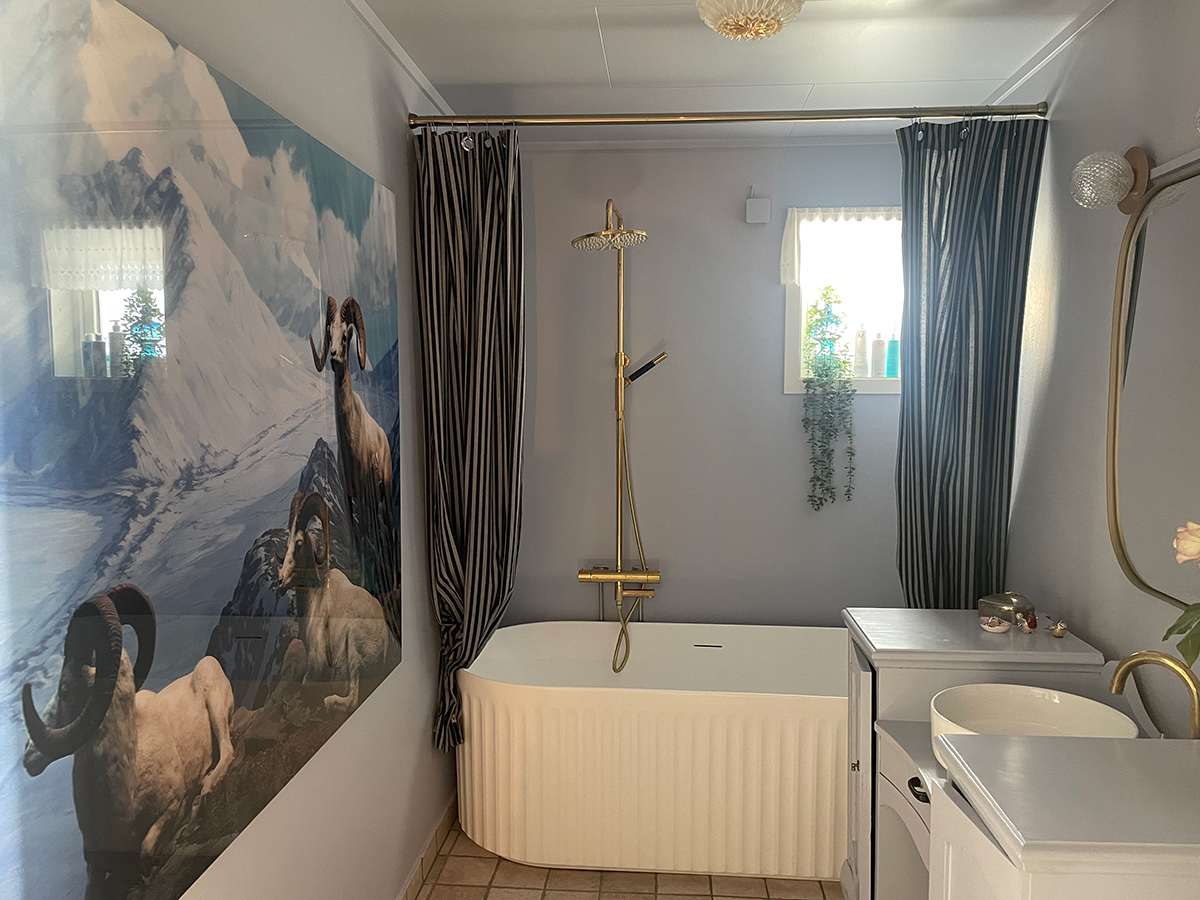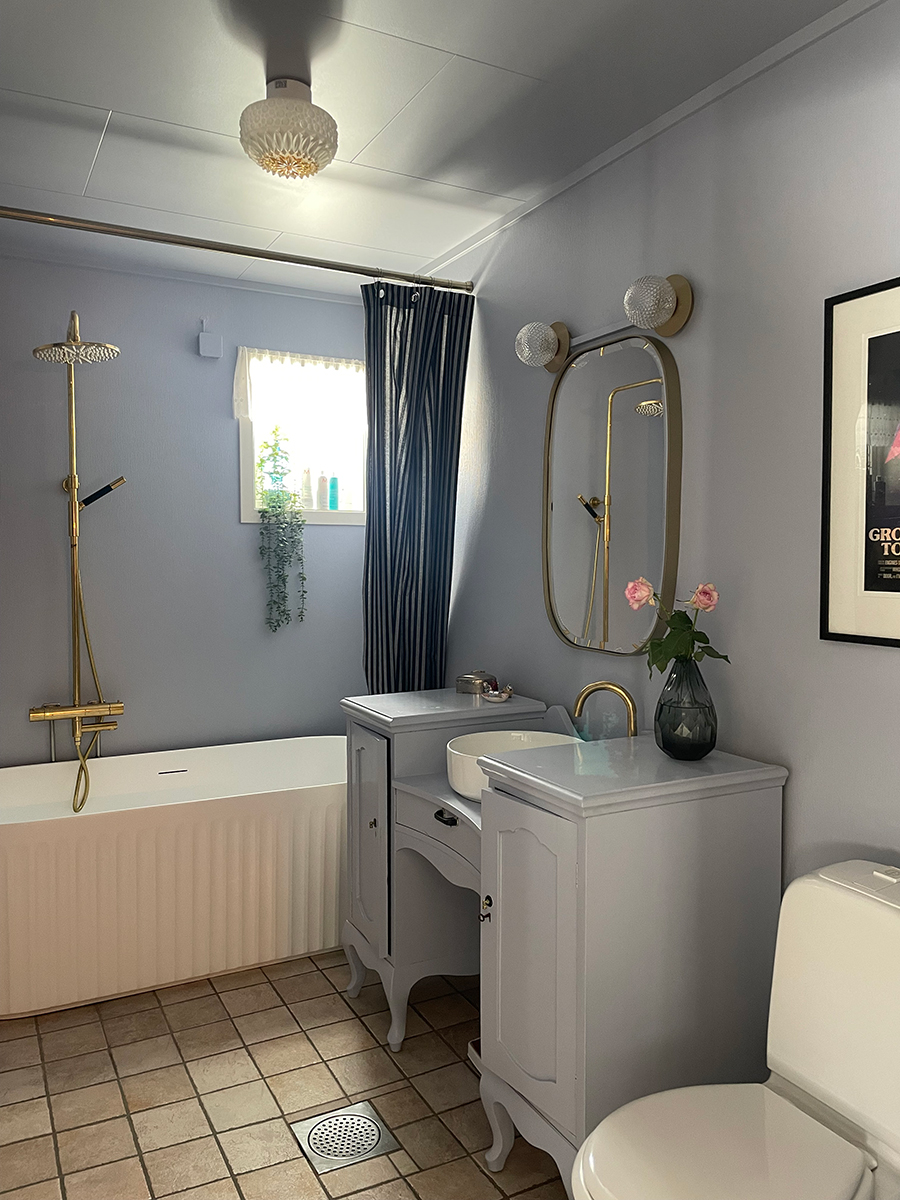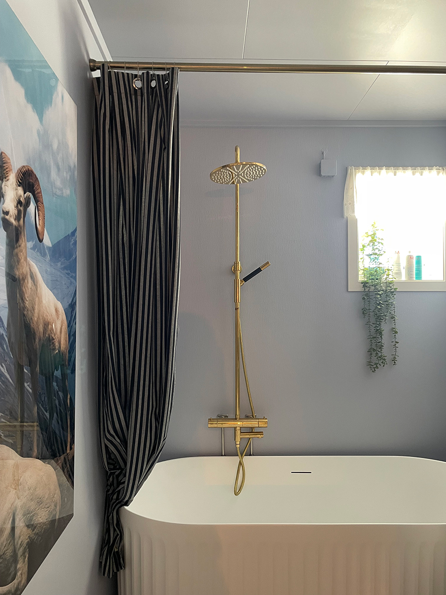 Det store badekaret har riller i front og er det perfekte sted å slappe av etter en lang dag med oppussing eller skogsturer. Dusj og servantkran er i oksiderende messing fra Tapwell og dusjgardinene fra Ferm Living. Igjen er det fokus på detaljer som kunst på veggen og vakre objekter i form av vaser og tilbehør.