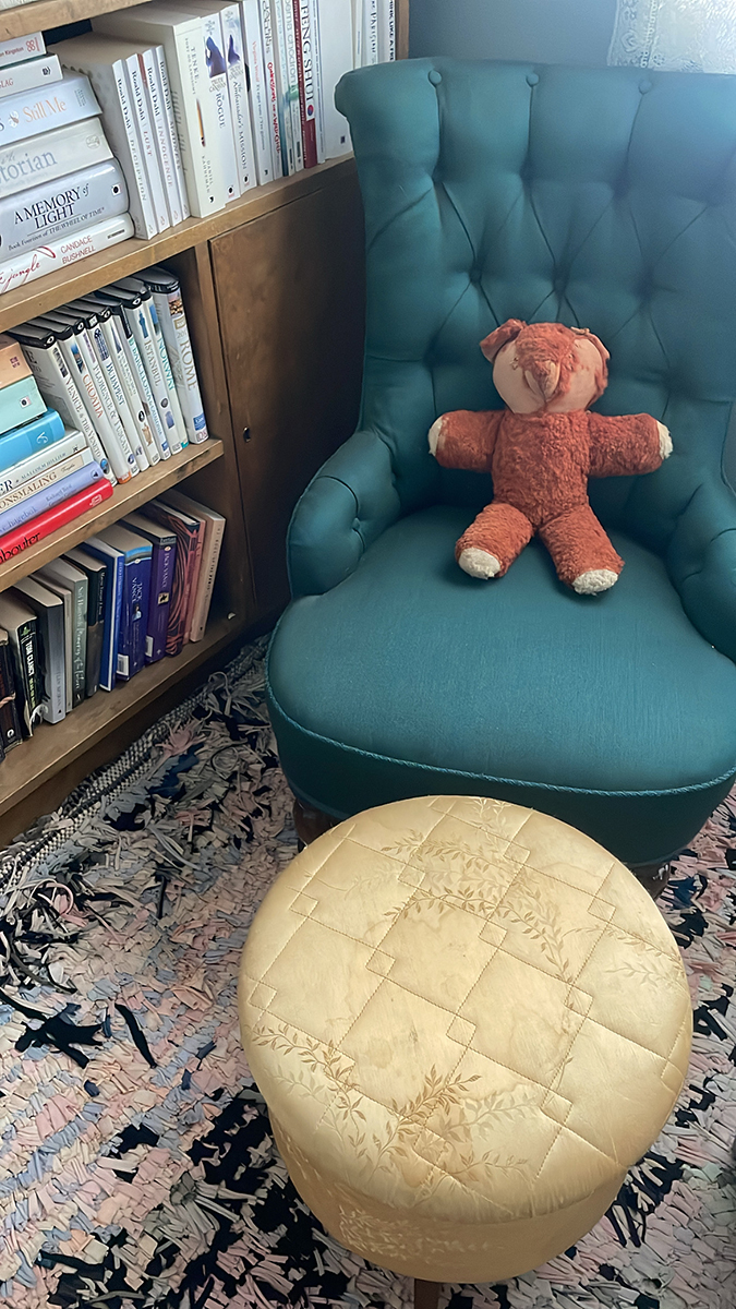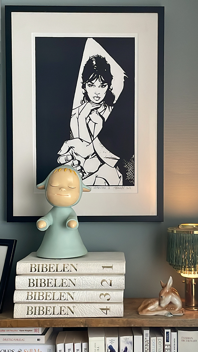 Den grønne ammestolen er kjøpt brukt og det samme er den gule puffen, bordlampen med frynser og nattbordet. Figuren på bibelen heter Little Wanderer og er laget av den japanske kunstneren Yoshitomo Nara og ble kjøpt på Eske for 20 år siden, mens bibelen i 4 bind er en konfirmasjonsgave. Det rufsete gulvteppet ble kjøpt på Jane Doe i sin tid, og bamsen som er tynnslitt av kjærlighet var Karinas første leke. Alt i alt er hytten fylt av arvegods, vintage-funn, designer-lamper og mengder av minner. Det er ikke så rart at dette er Karinas yndlingssted i hele verden.