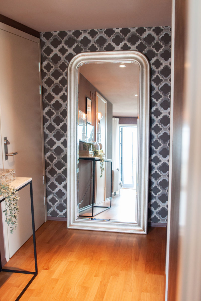 Soverommet er det minste rommet i leiligheten. Her er det rett og slett knapt plass til en stor dobbeltseng, men rommet er som et lite smykkeskrin med en vakker gullfarget tapet på alle vegger og en mørkebrun farge i taket. Sengen er deilig og myk, og full av puter og lekre tekstiler. Bak sengen henger en delikat fløyelsgardin og over den gamle kommoden henger det vakre Diamond-speilet fra Reflections Copenhagen. Alt i alt er det et utrolig behagelig rom å sove i og et sted man virkelig kan drømme seg bort i.