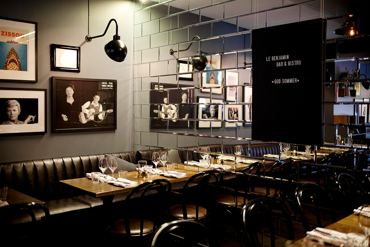 Utenom Kolonialen er Le Benjamin Karinas absolutte favorittrestaurant. Gleden var derfor stor da hun fikk i oppdrag av eierne å oppgradere innredningen. Med Le Benjamins sterke fokus på det franske kjøkken var det naturlig å gjøre en vri på den klassiske franske bistro-stilen. Støvete blå og røde vegger ga en varm og intim bakgrunn til klassiske sorte skinnsofaer og café stoler, og de lekne billedveggene gjorde lokalet intimt og personlig.