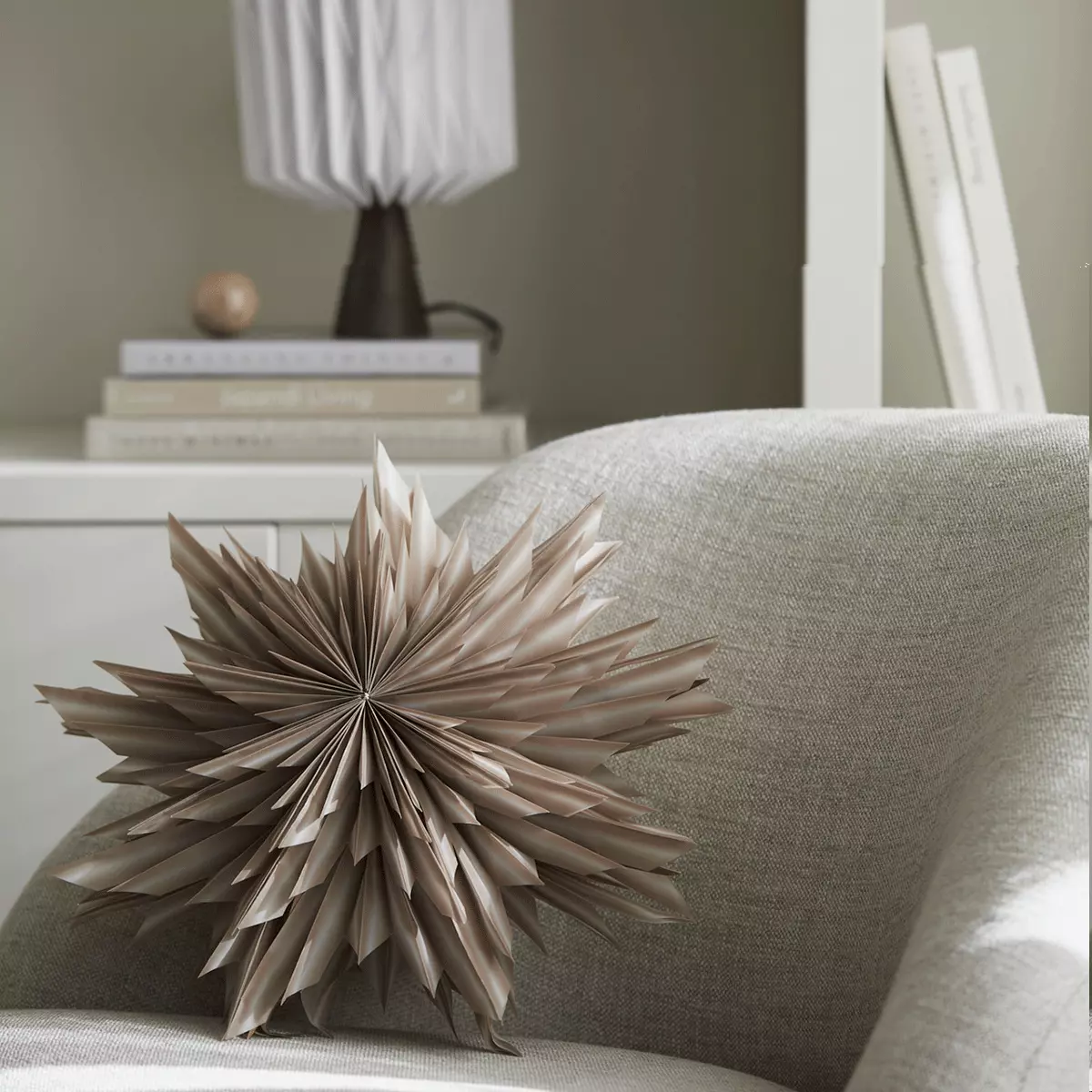 Helena fra Watt & Veke er en flerdimensjonal adventsstjerne laget av lag på lag med halvgjennomsiktig papir i vakker beige ombré. Den håndlagde stjernen sprer en myk, varm glød og gir et elegant uttrykk til hjemmet.