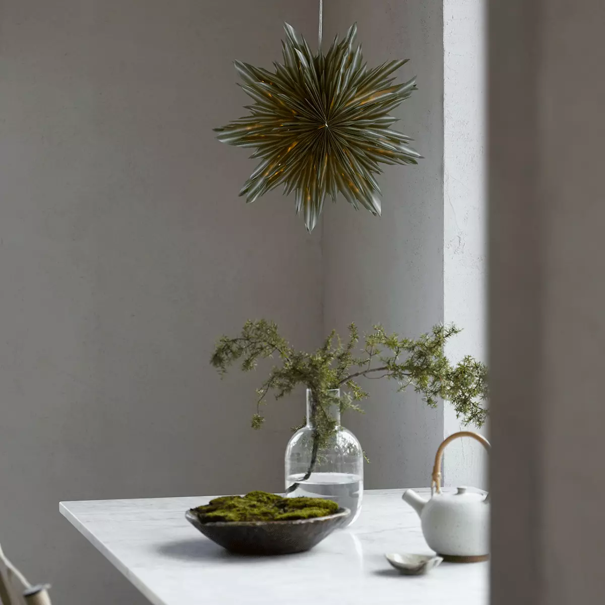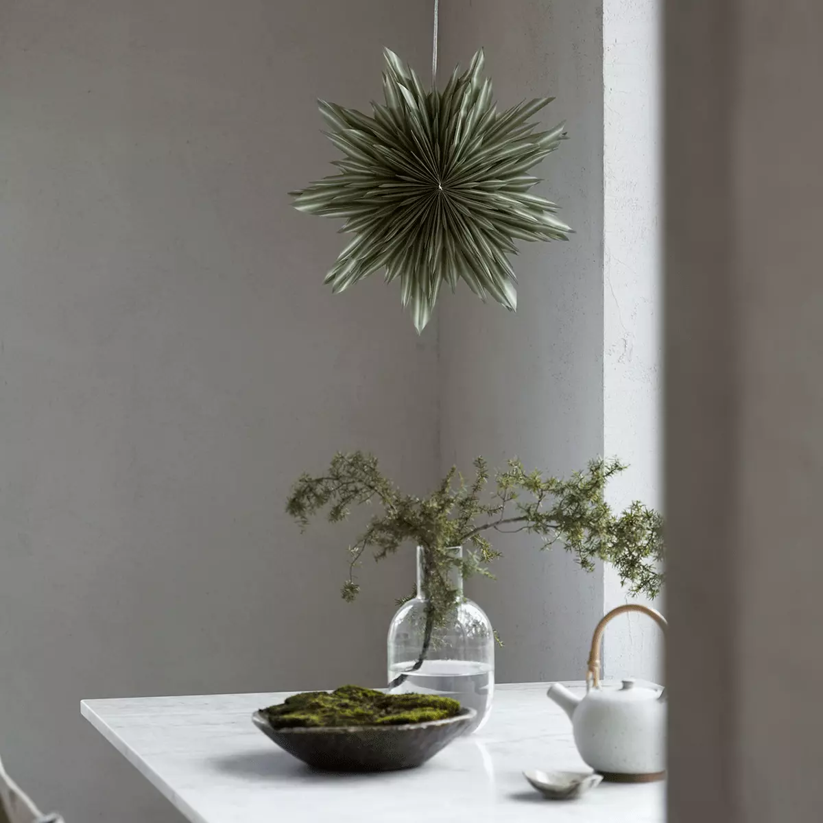 Helena 44 fra Watt & Veke er en håndlaget, flerdimensjonal adventsstjerne i halvgjennomsiktig papir med vakker grønn ombré-effekt. Den gir en myk og varm glød som skaper elegant julestemning i ethvert rom. Leveres i hvit gaveeske.