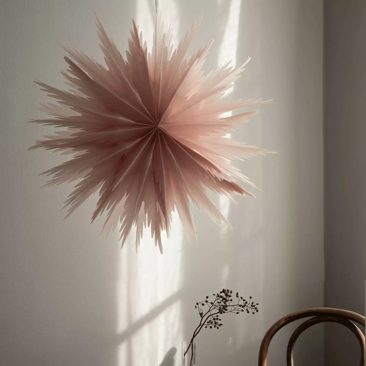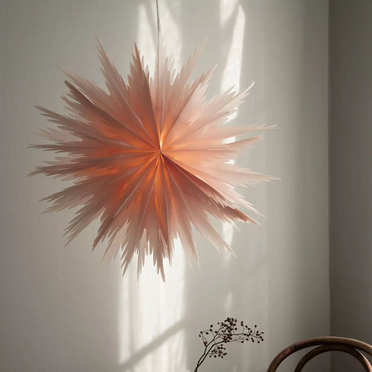 Liz 50 fra Watt & Veke er en håndlaget rosa adventsstjerne laget av flere lag med halvgjennomsiktig papir. Det lette, delikate designet gir en myk glød og skaper en varm og moderne julestemning. Leveres i praktisk oppbevaringseske.