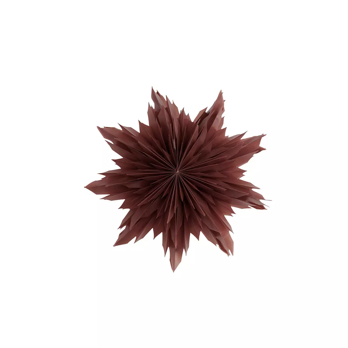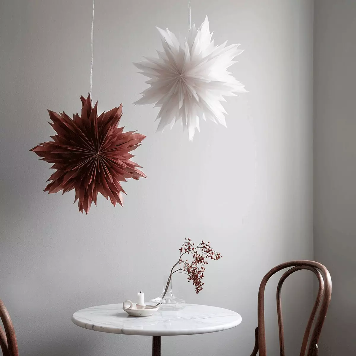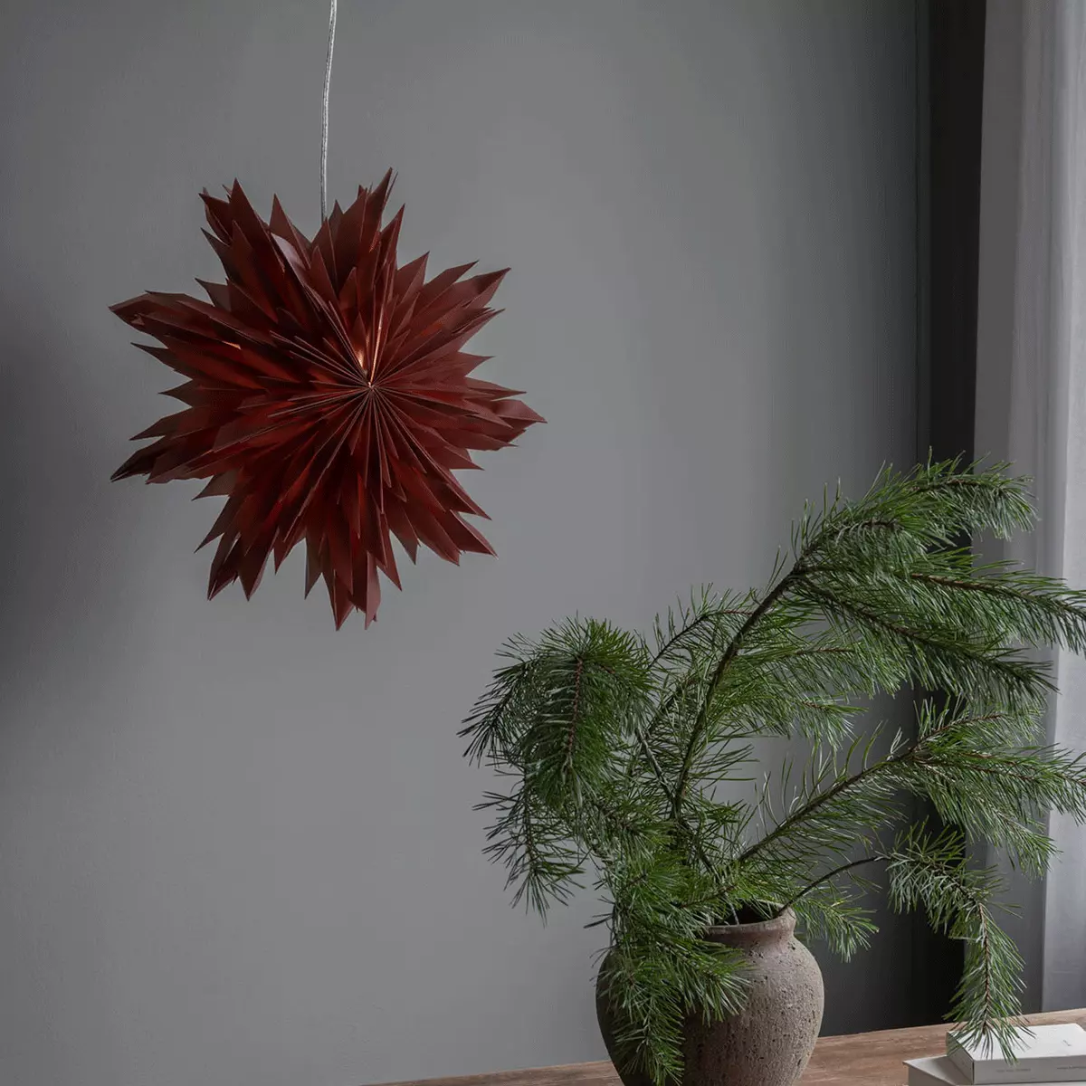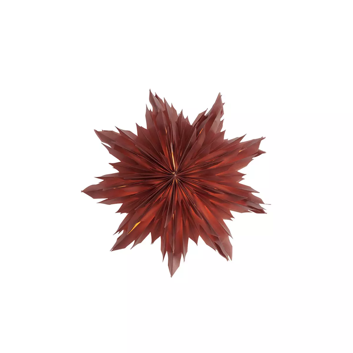 Oslo 44 Red Ochre fra Watt & Veke er en håndlaget adventsstjerne i tre lag halvgjennomsiktig papir. Den dype rødfargen og lagvise strukturen gir et varmt, stemningsfullt lys som passer perfekt i mindre rom eller vinduer. Leveres i elegant hvit eske for trygg oppbevaring år etter år.