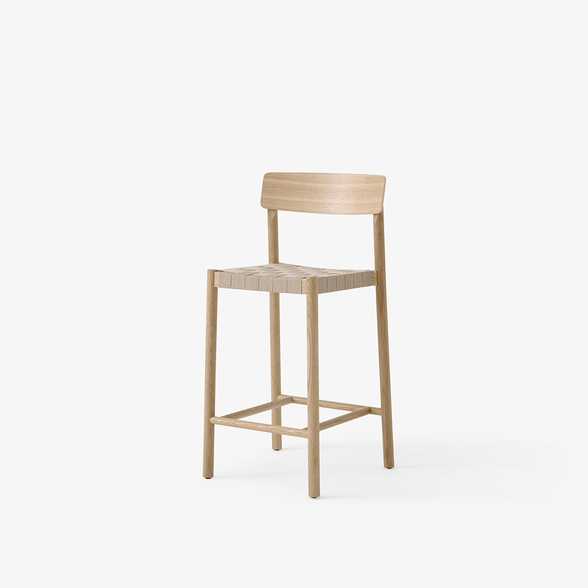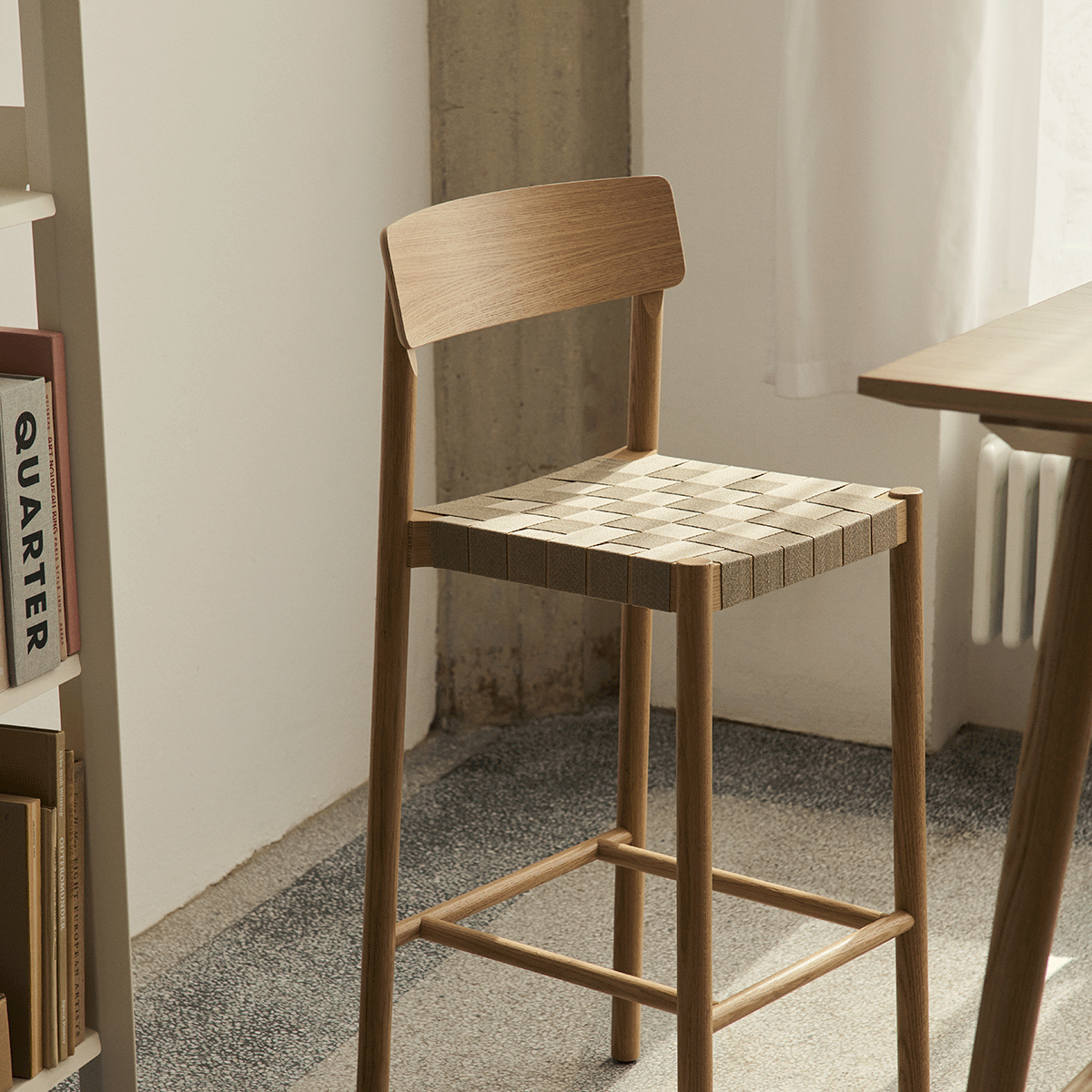 Betty TK12 Barstol fra &Tradition i lys eik med natural webbing. Barstolen er skreddersydd for å gi den ideelle sittehøyden ved kjøkkenbenken eller kjøkkenøya. Med sitt elegante design kombinerer stolen funksjonalitet og tidløs stil, slik at du kan nyte en behagelig og støttende sitteopplevelse i hverdagen. barstolen bygger videre på sjarmen fra det originale Betty-designet, men i en høyere versjon som passer perfekt til moderne kjøkkenmiljøer.