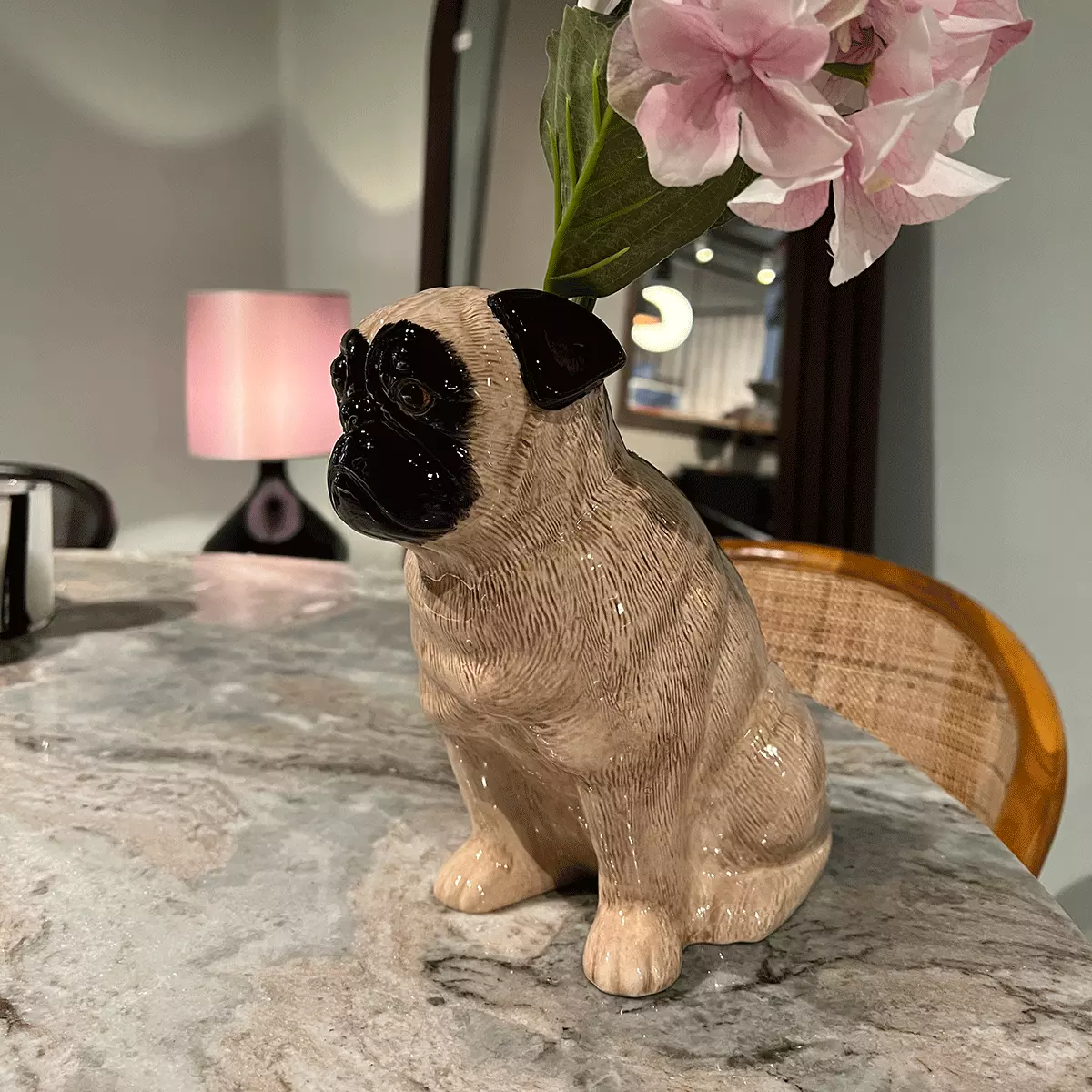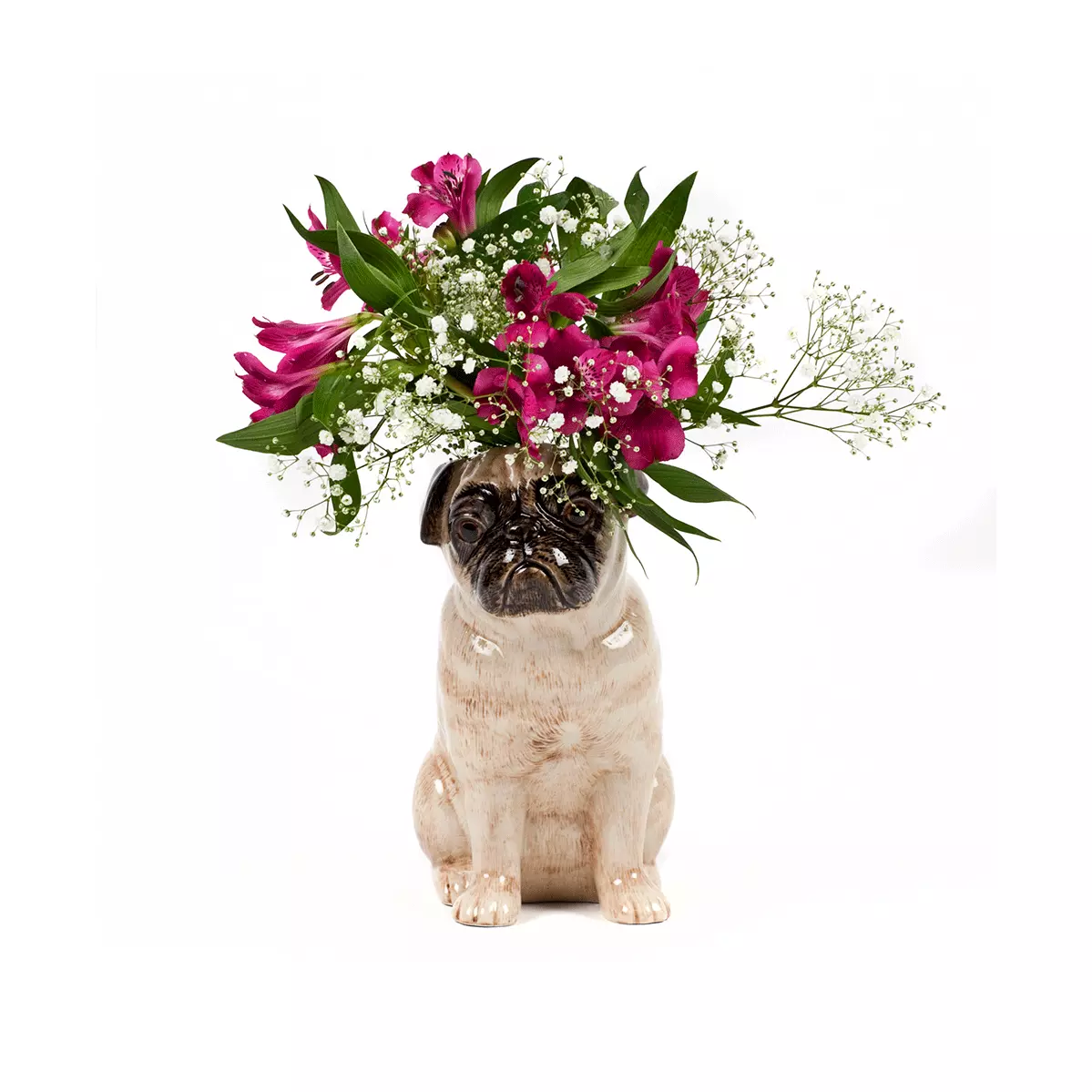 Blomstervase Large Mops fra Quail Ceramics er en sjarmerende og dekorativ vase formet som en mopshund, håndmalt med flotte detaljer og uttrykksfull personlighet. Den fungerer like fint med en frisk blomsterbukett som alene på en hylle eller skjenk, og tilfører hjemmet et lekent, men stilfullt preg. En unik interiørdetalj som kombinerer britisk design, kvalitet og humor – perfekt som gave eller som et blikkfang i eget hjem.