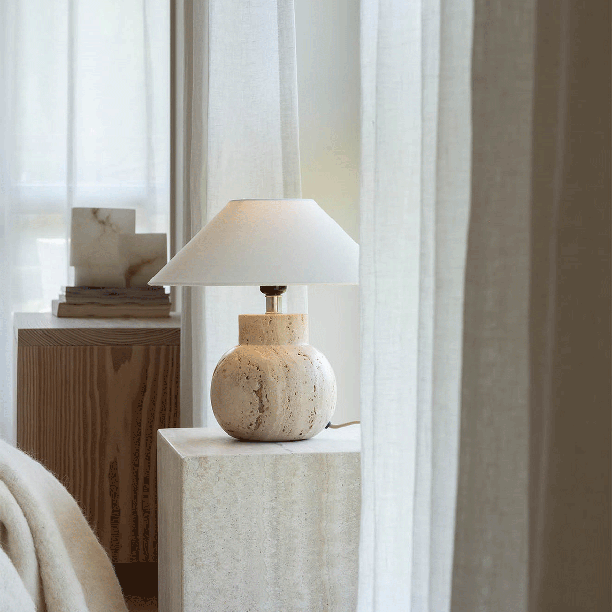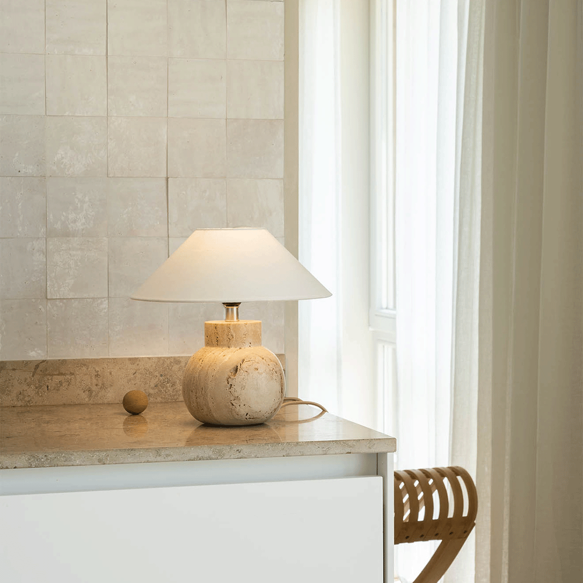 Pella Traverin bordlampe kombinerer rustikk sjarm med tidløs eleganse. Den runde formen og den rå travertin-overflaten gir et mykt og organisk uttrykk. Travertin er en porøs naturstein med unike farge- og mønsterdetaljer, noe som gjør hver lampe helt unik. Velg en lampeskjerm etter eget ønske for å skape en personlig og stilfull bordlampe som passer til både moderne og klassiske interiørstiler. Lampen leveres med en beige tekstilledning med bryter, som tilfører en elegant kontrast til steinen.