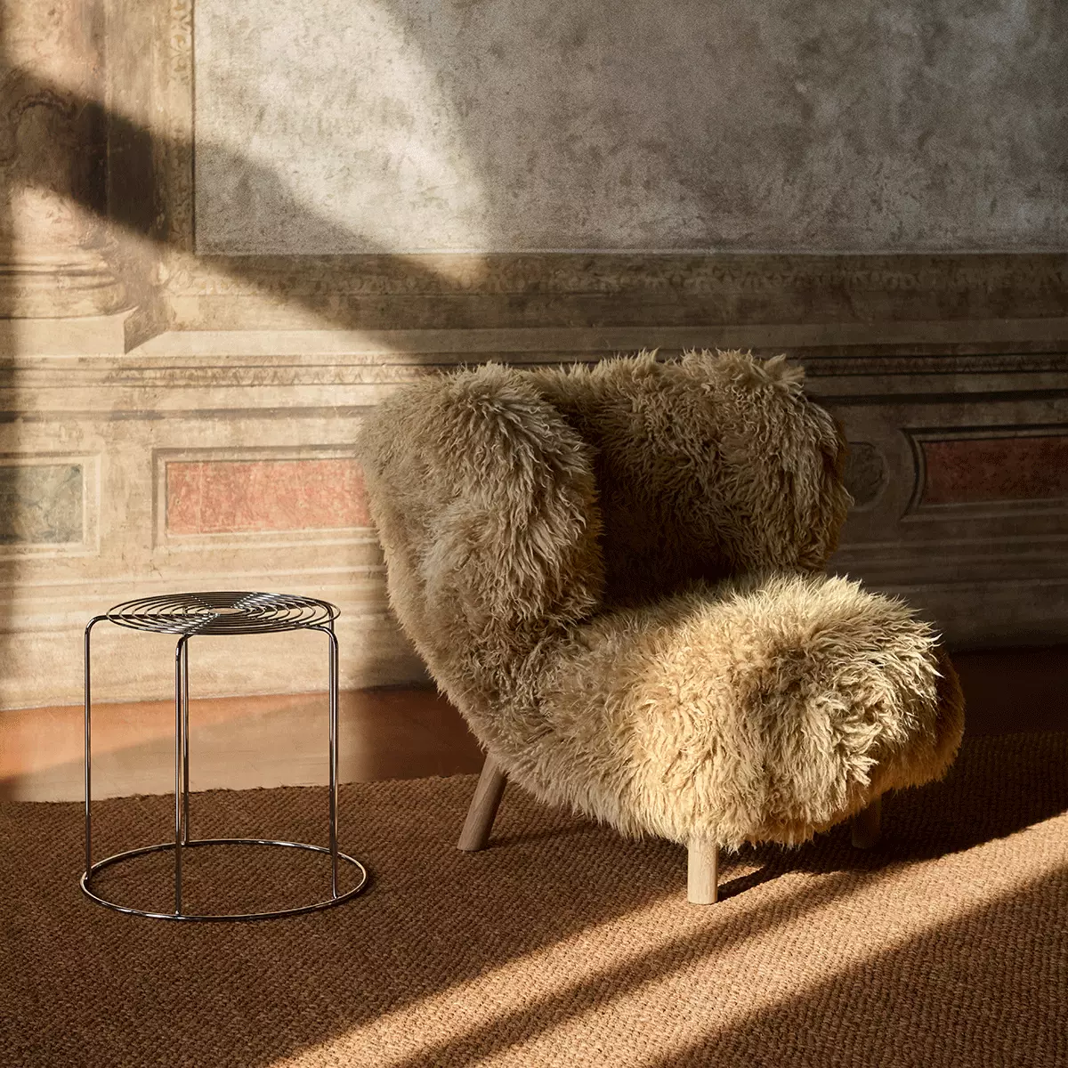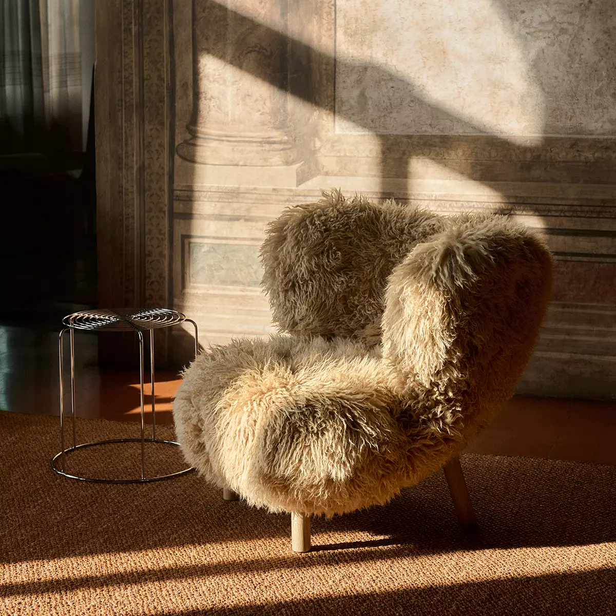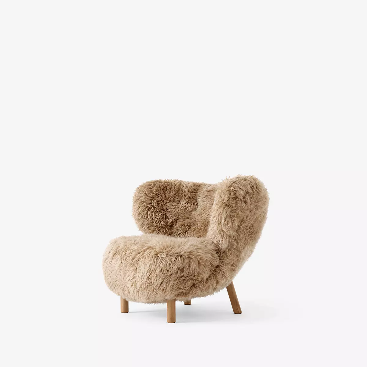 Nydelig lenestol i lammeskinn i Honey med bein i oljet eik fra &tradition. Stolen er designet av Viggo Boesen i 1938, og er et Dansk signaturdesign.