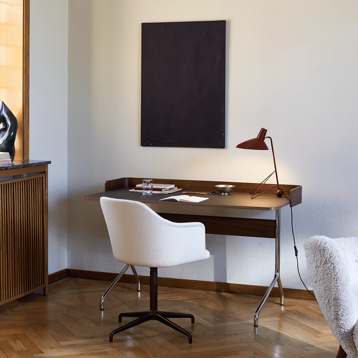 Da Anderssen & Voll startet med Pavilion-stolserie, hentet den prisbelønte duoen sin inspirasjon fra den ikoniske Langelinie Pavilion. Nå er denne lette og lyriske estetikken oversatt til et kompakt skrivebord beregnet til både kontor- og hjemmekontor. Pavilion skrivebordet ble designet ved starten av pandemien og tok hensyn til hjemmearbeidskravene med en versjon som har et bakpanel.