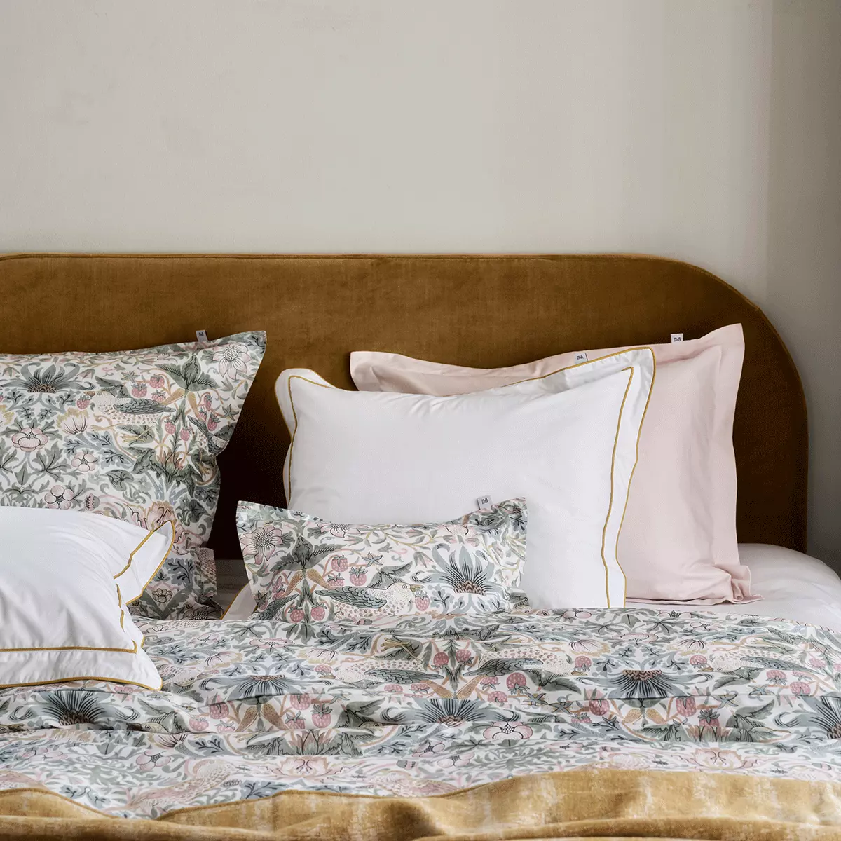 Dynetrekk i crispy percale av 100 % finkjemmet bomull med høy trådtetthet på 300 tc, som gir en sval, glatt og luksuriøs hotellfølelse. Det ikoniske Strawberry Thief-mønsteret, designet av William Morris i 1883, kombinerer detaljerte blomster og fugler med en fascinerende historie inspirert av Morris’ egne hageopplevelser. Percalen er vevd av lange, sterke bomullsfibre som sikrer varig kvalitet og komfort, selv etter gjentatte vask. Dynetrekket lukkes med elegante knapper, er produsert i Portugal og sertifisert med STANDARD 100 by OEKO-TEX® – et eksklusivt valg for deg som ønsker tidløst, luksuriøst sengetøy med designarv.