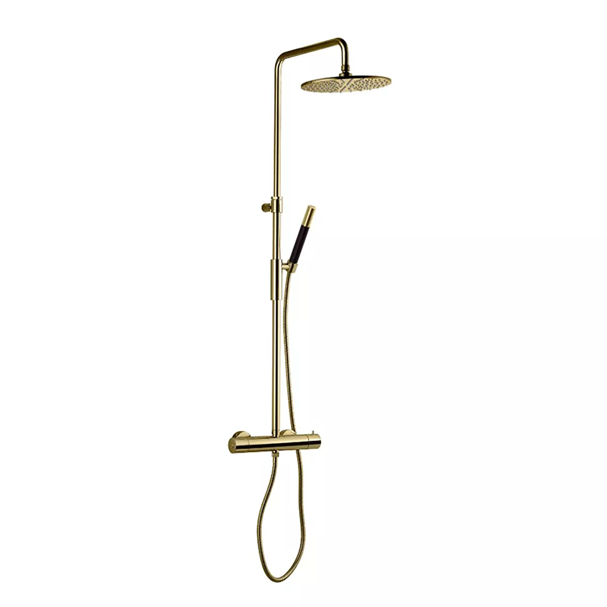 Opplev maksimal komfort med TVM 7200 i Honey Gold – en komplett takdusjløsning i tidløst og stilrent design, vår bestselger! Dusjen har trykk- og termostatstyrt dusjbatteri for jevn vanntemperatur og automatisk trykkstyring som gir stabilt vanntrykk selv på rørnett med mange tappepunkter. Den justerbare teleskopstangen (770–1225 mm), rund taksil (Ø250 mm) og medfølgende hånddusj gjør det enkelt å tilpasse dusjopplevelsen. Leveres komplett med dusjbatteri, taksil, hånddusj, dusjslange og justerbar festebrakett – et stilrent, funksjonelt og gjennomtestet valg for ethvert moderne baderom.