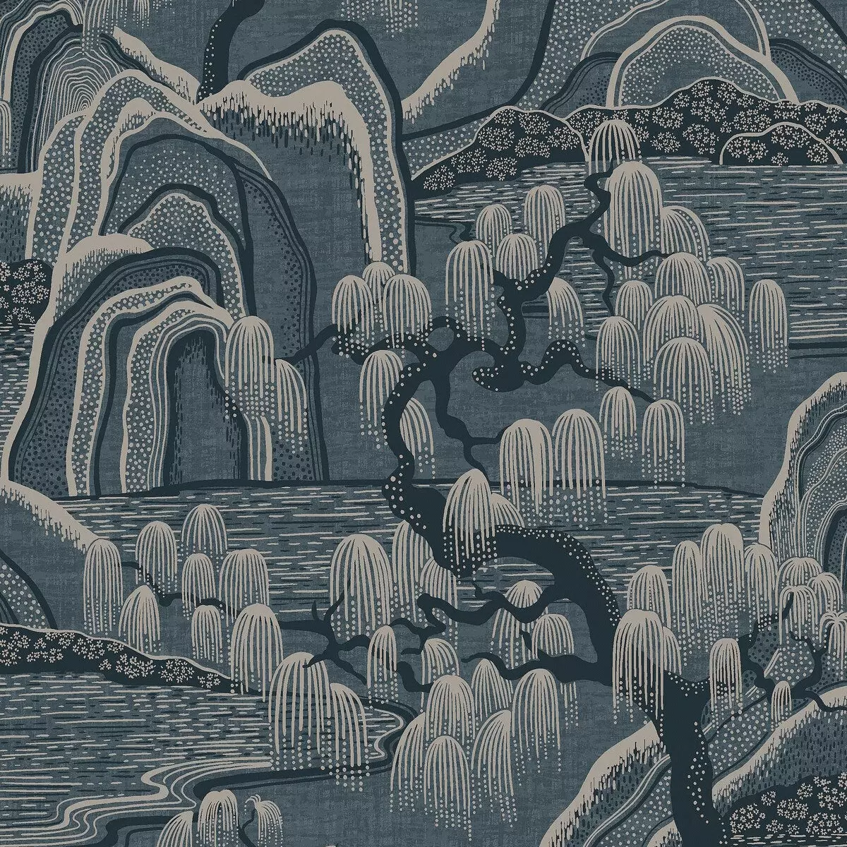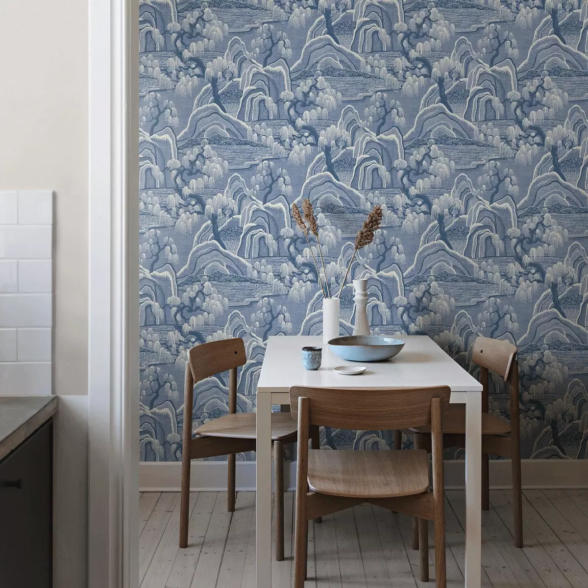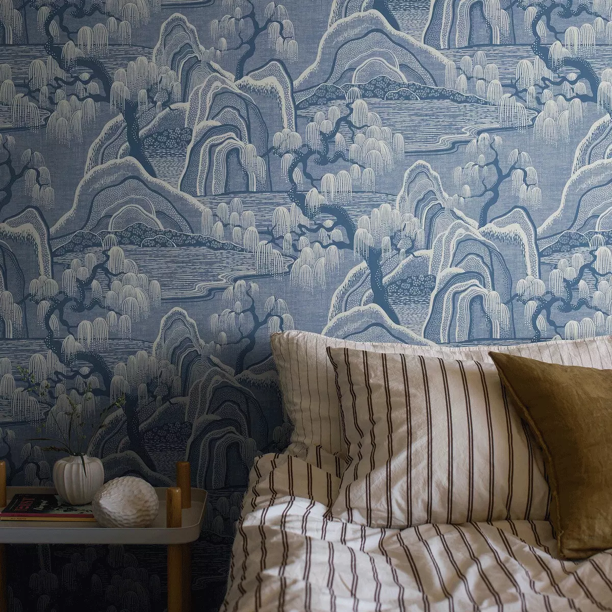 Indigo Garden er et eksklusivt, stormønstret tapet designet av Noomi Spange. Det stiliserte landskapet er sinnrikt oppbygd av prikker, streker og rytmiske mellomrom med inspirasjon fra japanske stoffer og kinesisk bildekunst. Et eventyraktig landskap der bunnen også har horisontale linjer som gir assosiasjoner til stille vann, i et mønster der det ellers er mye bevegelse.