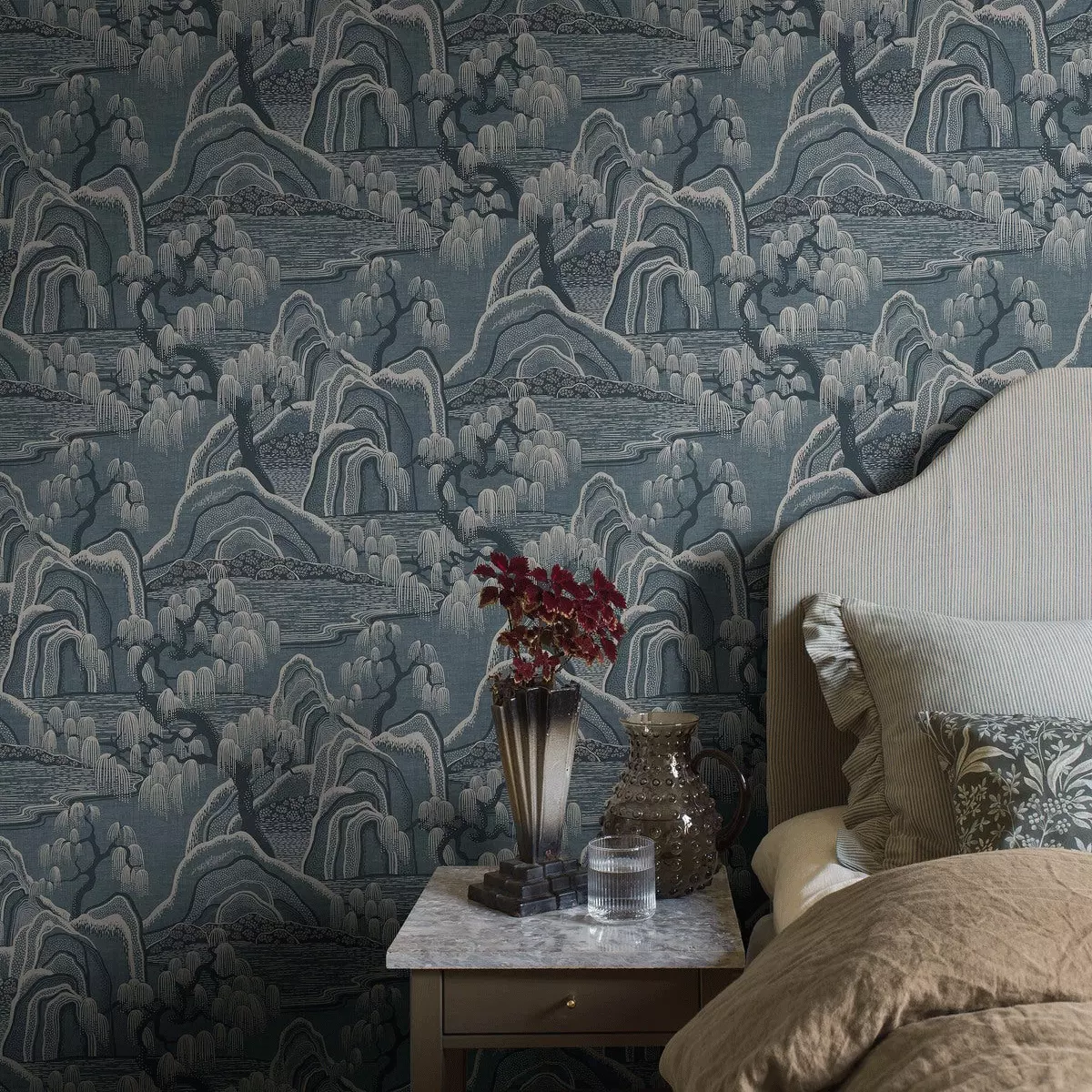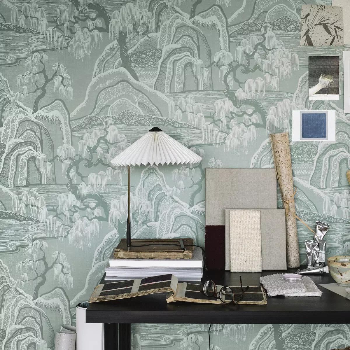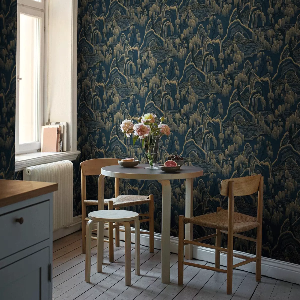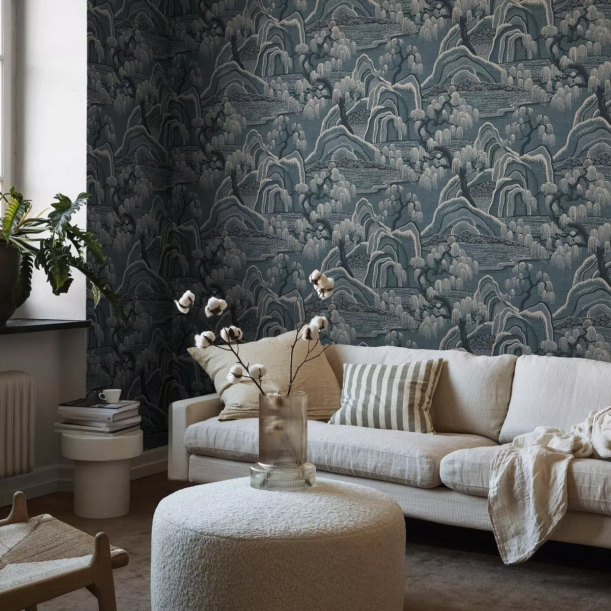 Indigo Garden er et eksklusivt, stormønstret tapet designet av Noomi Spange. Det stiliserte landskapet er sinnrikt oppbygd av prikker, streker og rytmiske mellomrom med inspirasjon fra japanske stoffer og kinesisk bildekunst. Et eventyraktig landskap der bunnen også har horisontale linjer som gir assosiasjoner til stille vann, i et mønster der det ellers er mye bevegelse.