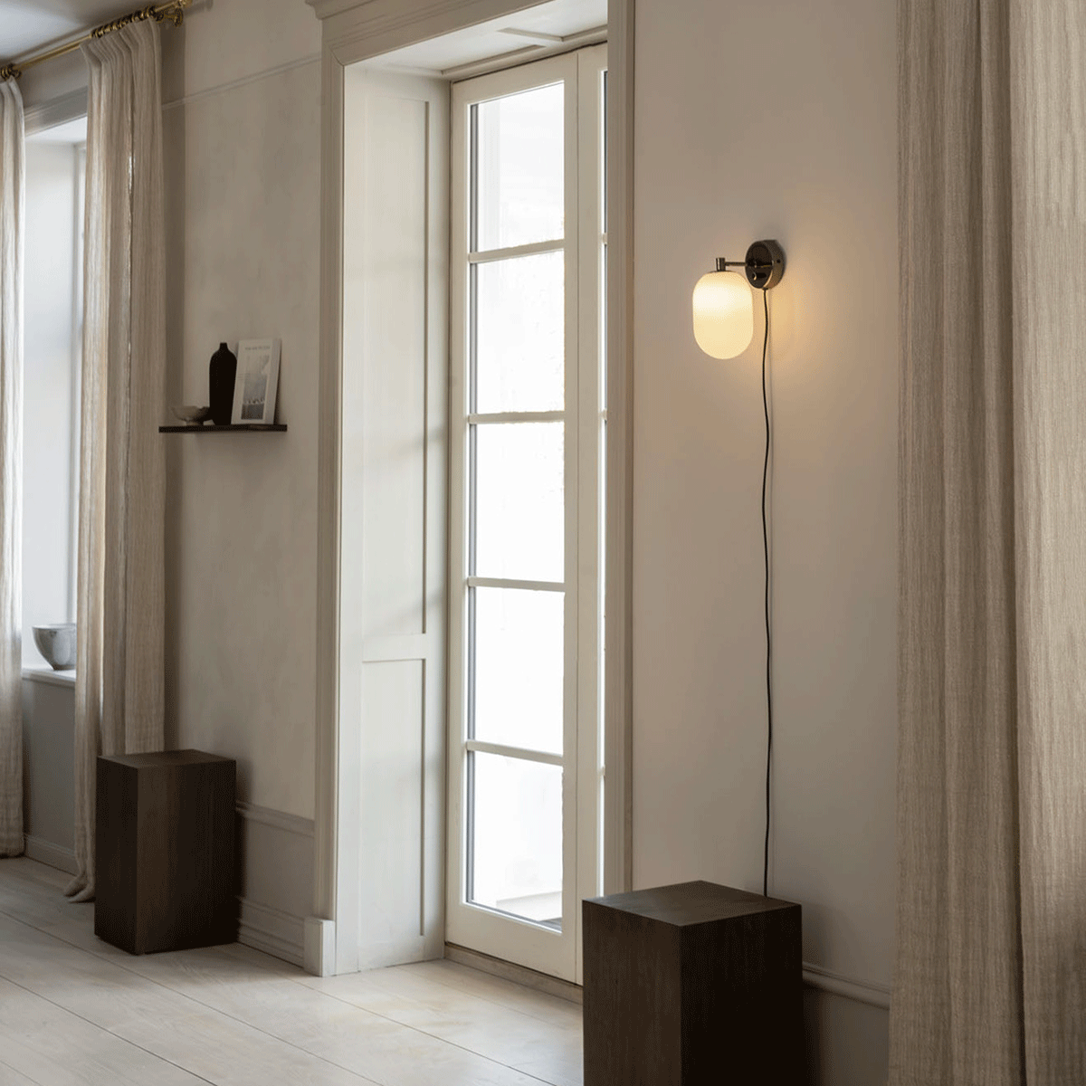 Noor vegglampe kombinerer tidløs eleganse med moderne funksjonalitet. Lampen er laget i eksklusivt munnblåst glass som gir et mykt og behagelig lys, mens detaljer i svart krom tilfører et raffinert og stilrent uttrykk. Med svart tekstilledning og integrert dimmer på veggfestet kan du enkelt justere lysstyrken og skape den rette atmosfæren i rommet. For et mer sømløst utseende kan lampen også kobles til fast installasjon, noe som gjør den like godt egnet for private hjem som for kommersielle miljøer.