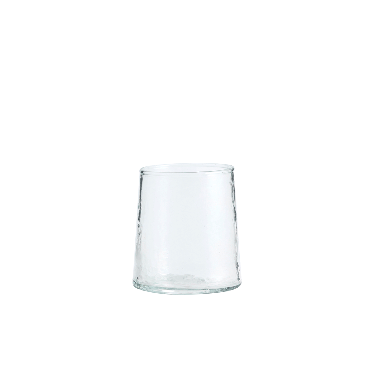 Vita vannglass fra Nordal. Glasset er munnblåst av 60 % resirkulert glass og har en lett hamret overflate som gir hver del et unikt og taktilt uttrykk. Rommer 200 ml og tåler oppvaskmaskin.