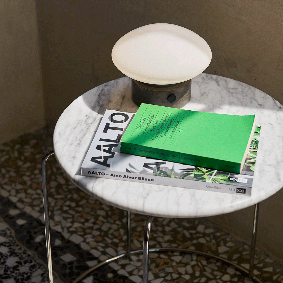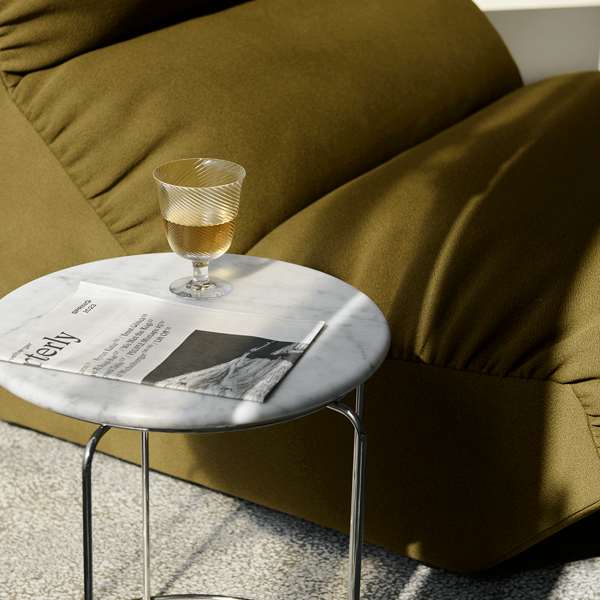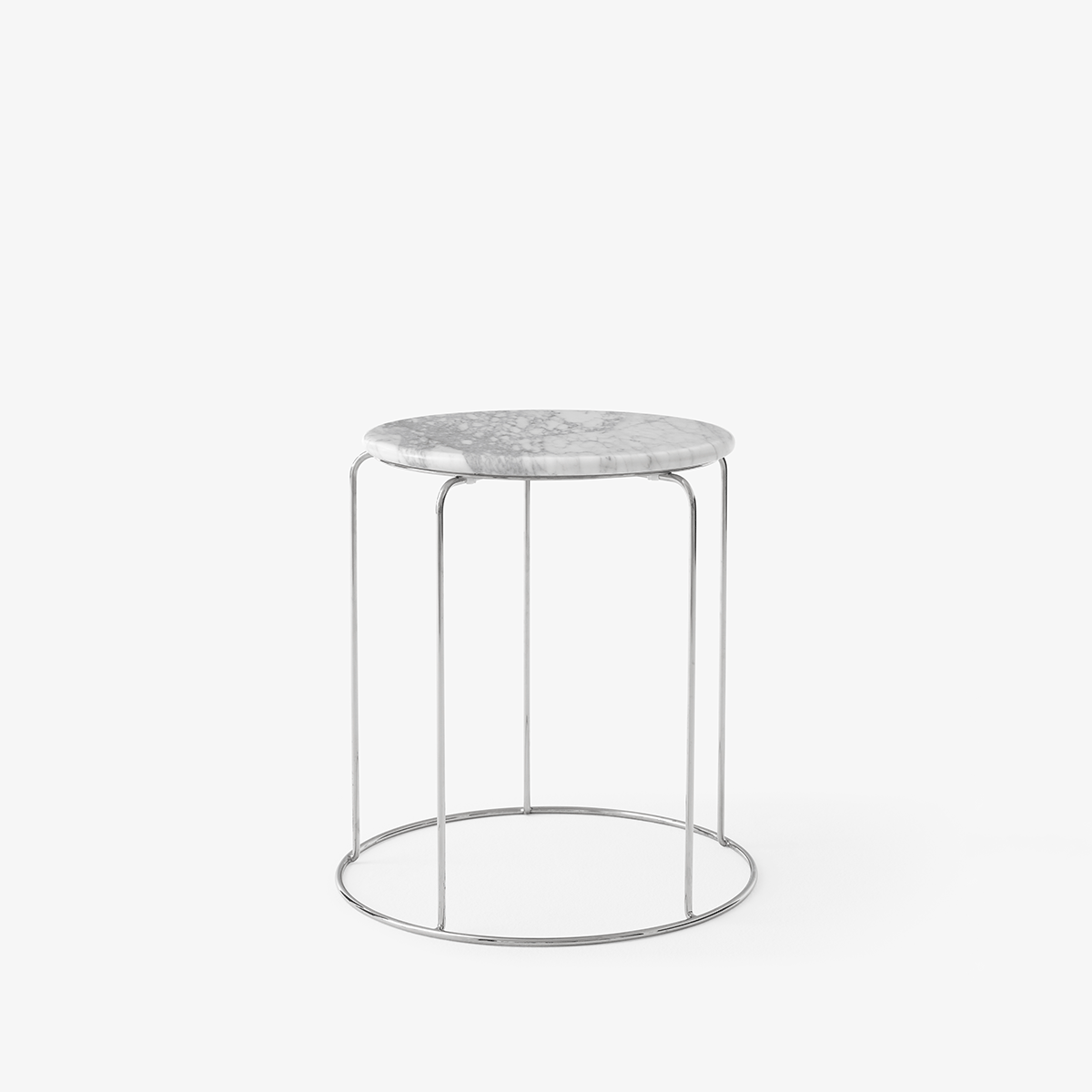 For enda mer funksjonalitet kan krakken oppgraderes med en marmorbordplate, spesialdesignet for å hvile på de konsentriske konturene til Wire Stool. Bordplaten tilfører et raffinert og taktilt element som løfter uttrykket, samtidig som krakken forvandles til et praktisk og eksklusivt sidebord. Perfekt for å sette fra seg en bok, kaffekopp eller et glass vin.